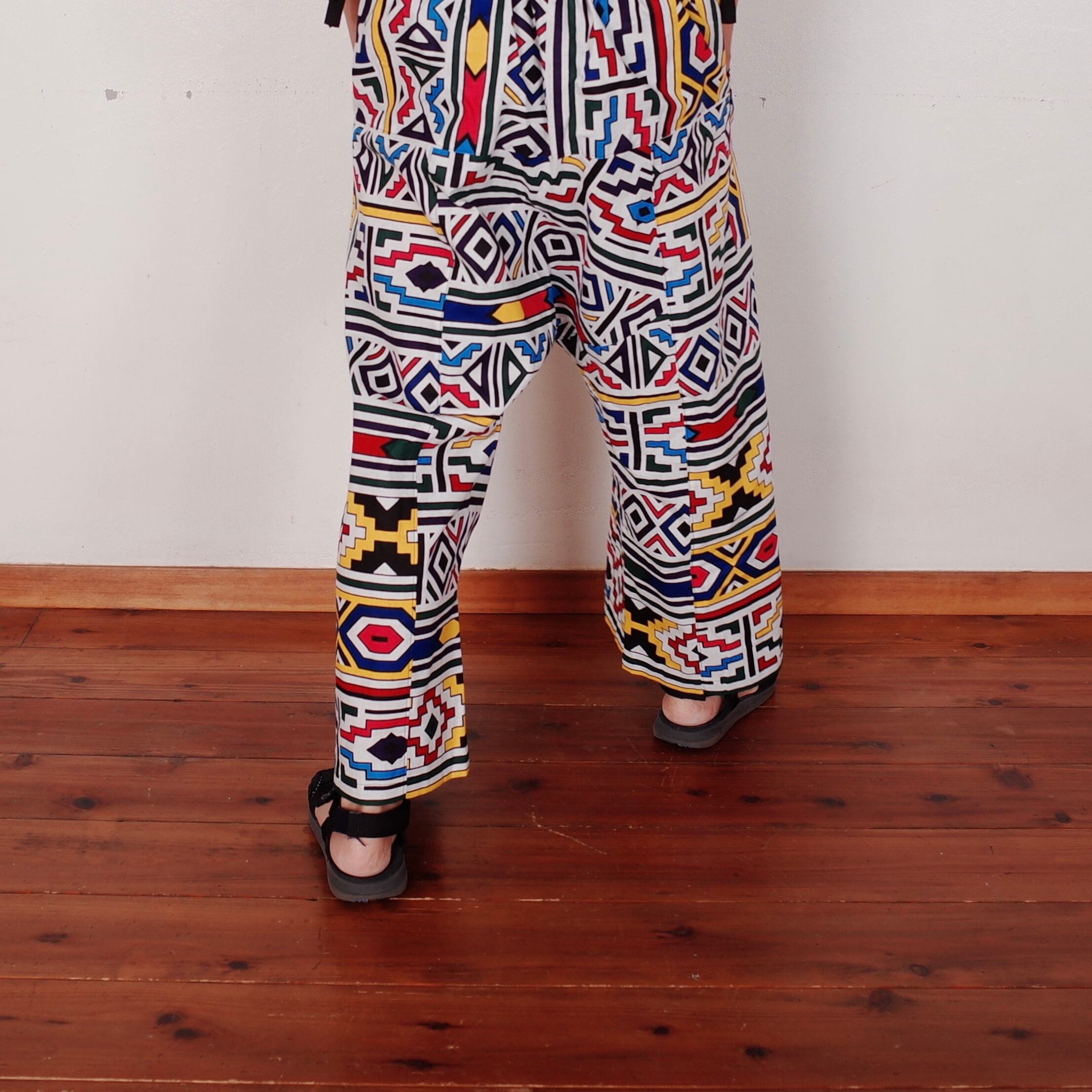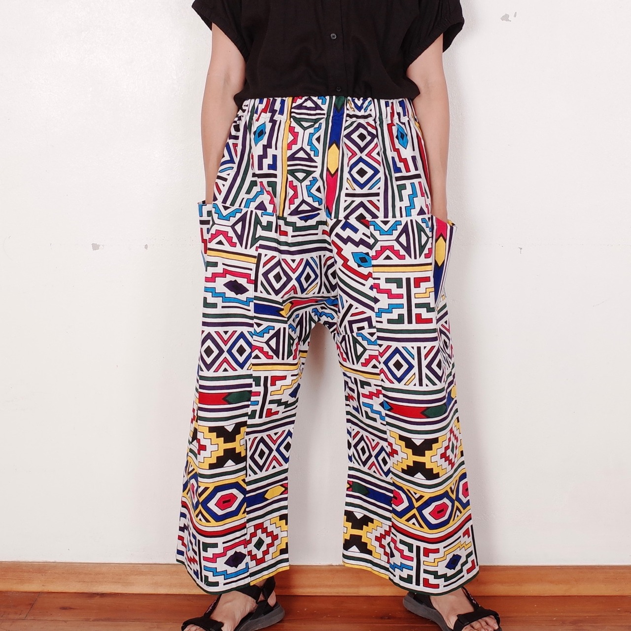 ザンビアのチテンゲ生地のパンツです。生地は現地でセレクトしました。タイパンツ風のパターンを少し調整して着回しよく着られるようにしました。dafa rafetとはセネガルのウォロフ語で「かわいい」という意味です。あらゆる年代のあらゆる体型の方がかわいく着られるカタチを目指しました。太めのウエストゴムはぐるりと一周、前後で同じパターンとなります。両サイドにポケット付です。