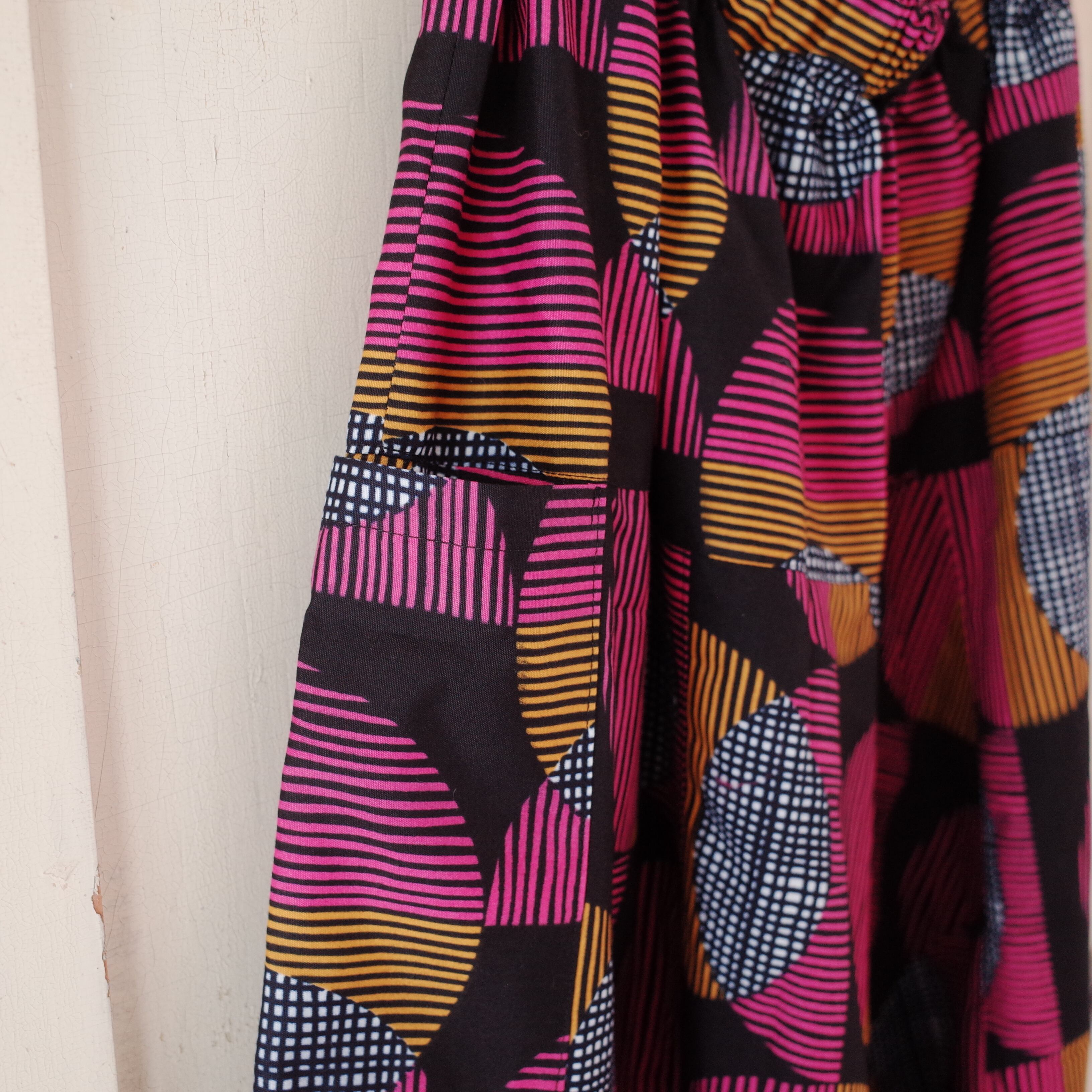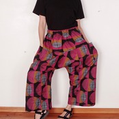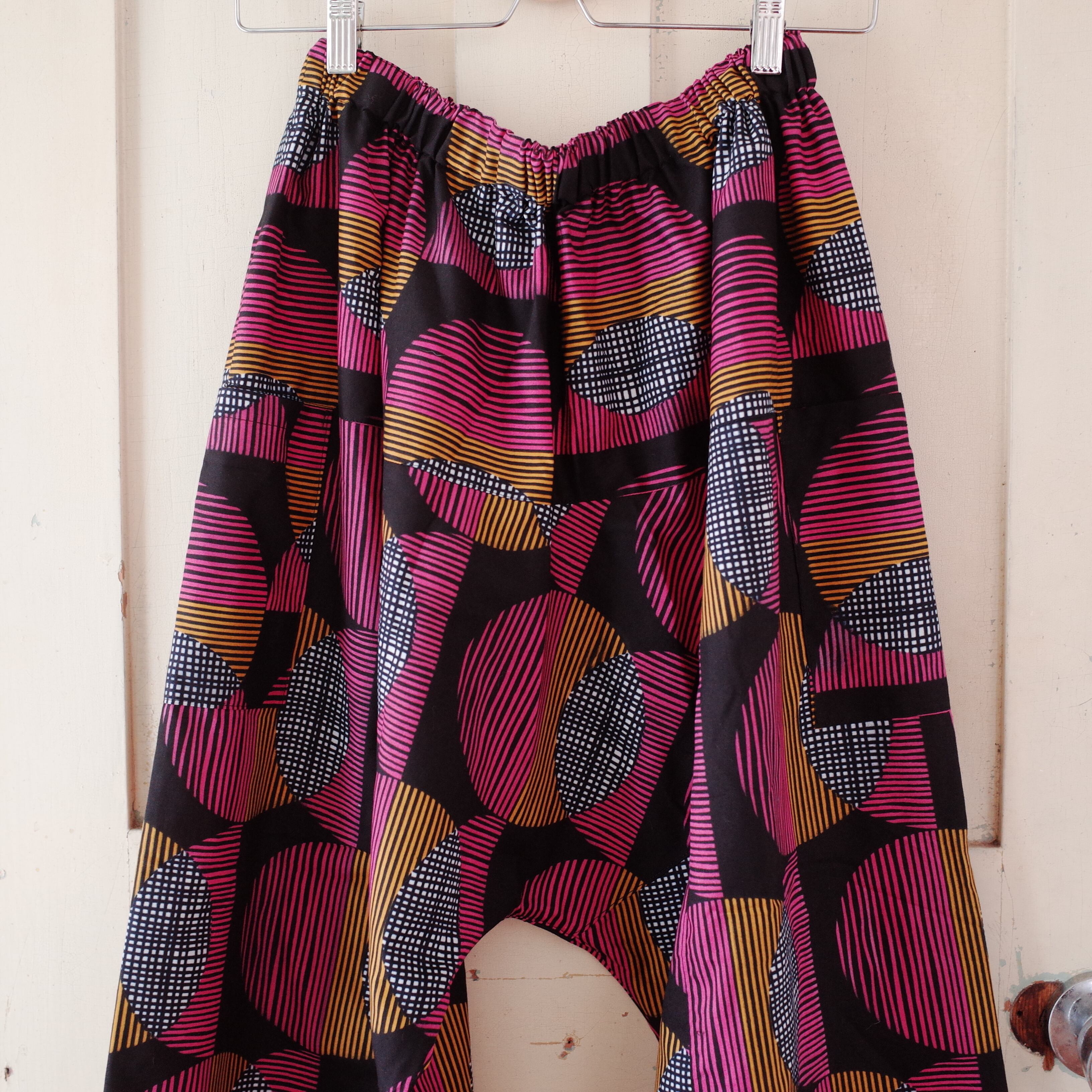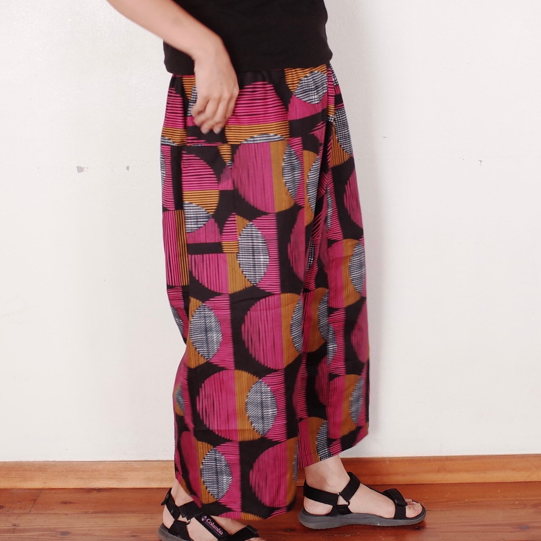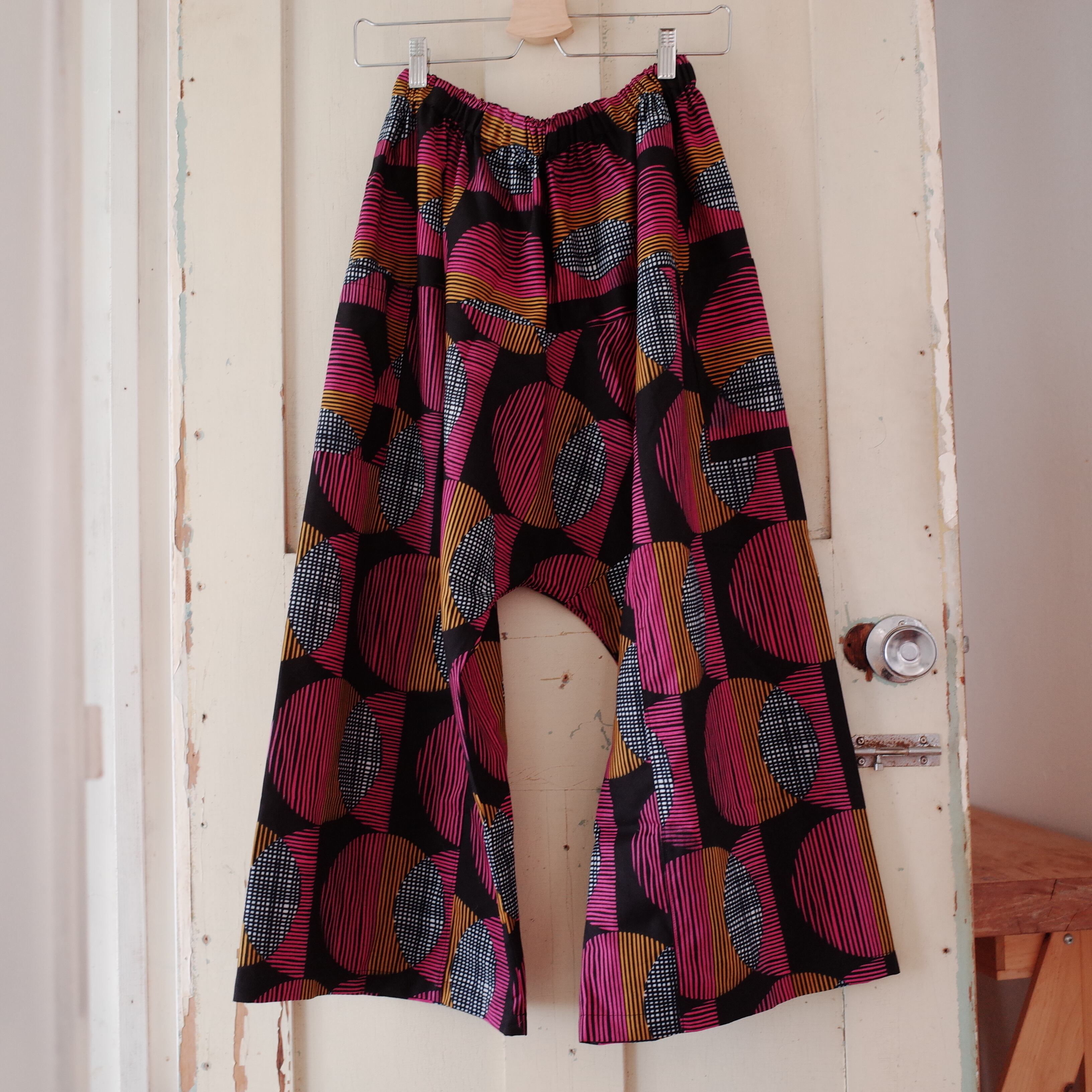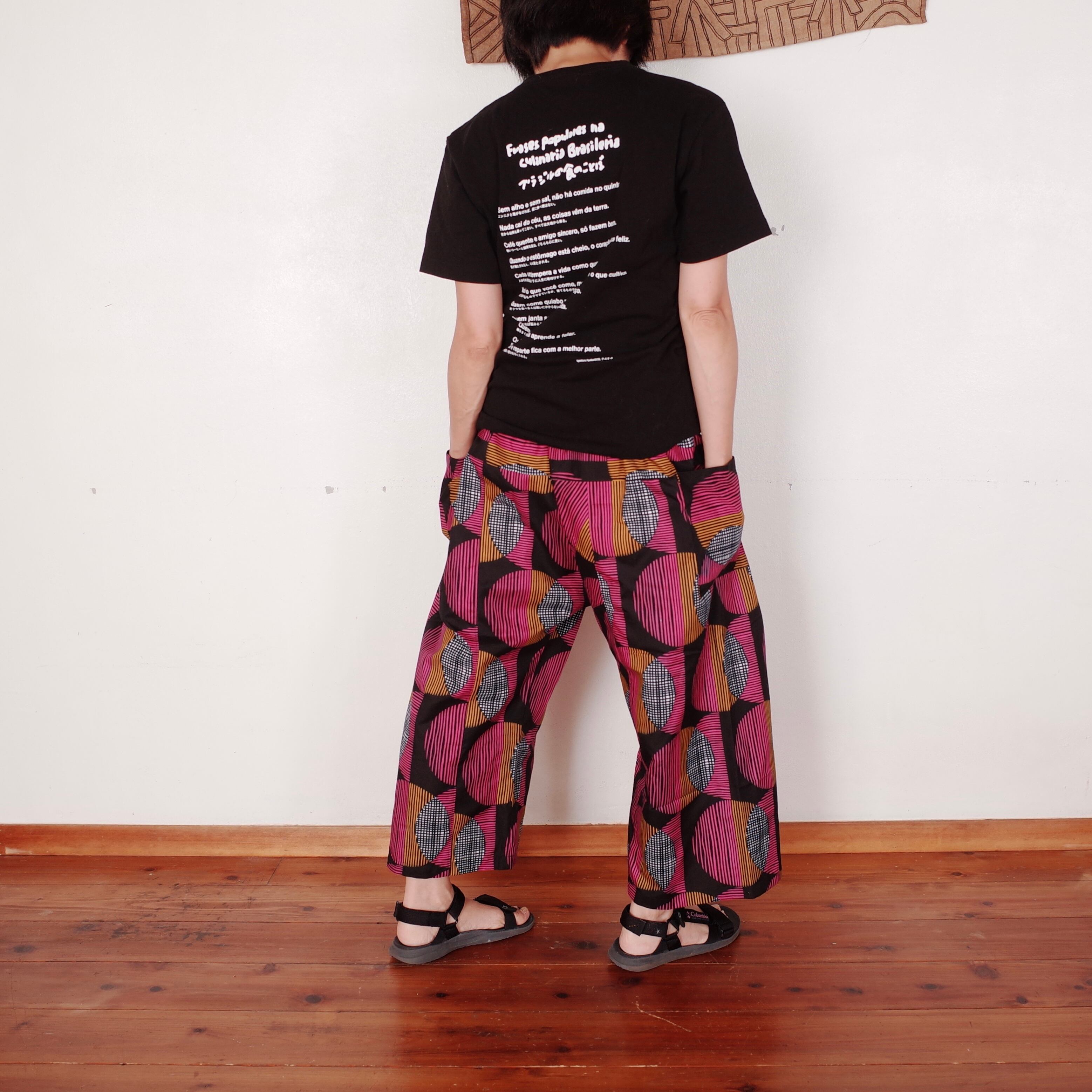 ザンビアのチテンゲ生地のパンツです。生地は現地でセレクトしました。タイパンツ風のパターンを少し調整して着回しよく着られるようにしました。dafa rafetとはセネガルのウォロフ語で「かわいい」という意味です。あらゆる年代のあらゆる体型の方がかわいく着られるカタチを目指しました。太めのウエストゴムはぐるりと一周、前後で同じパターンとなります。両サイドにポケット付です。