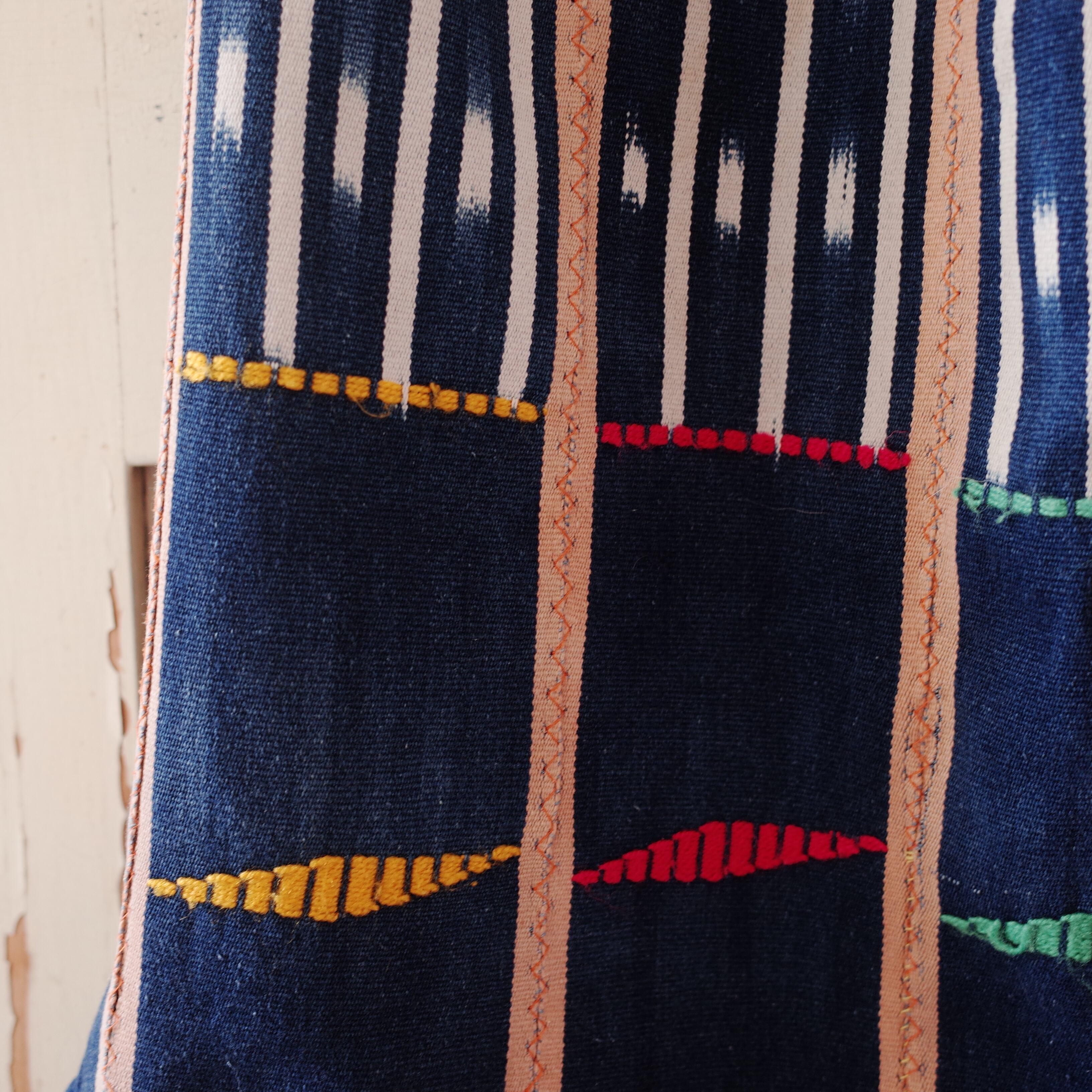 藍染めを制作しているバウレ族はアフリカ西部のコートジボアールに住む民族です。伝統の仮面舞踏ゴリで使われるお面が有名です。バウレ族の藍染布は、天然の藍で染めた糸を模様を作りながら手織りで制作されており、日本では絣と呼ばれる生地です。藍の色とカラフルな刺繍の色のコンビネーションが美しく、しなやかで肌触りの良い布です。