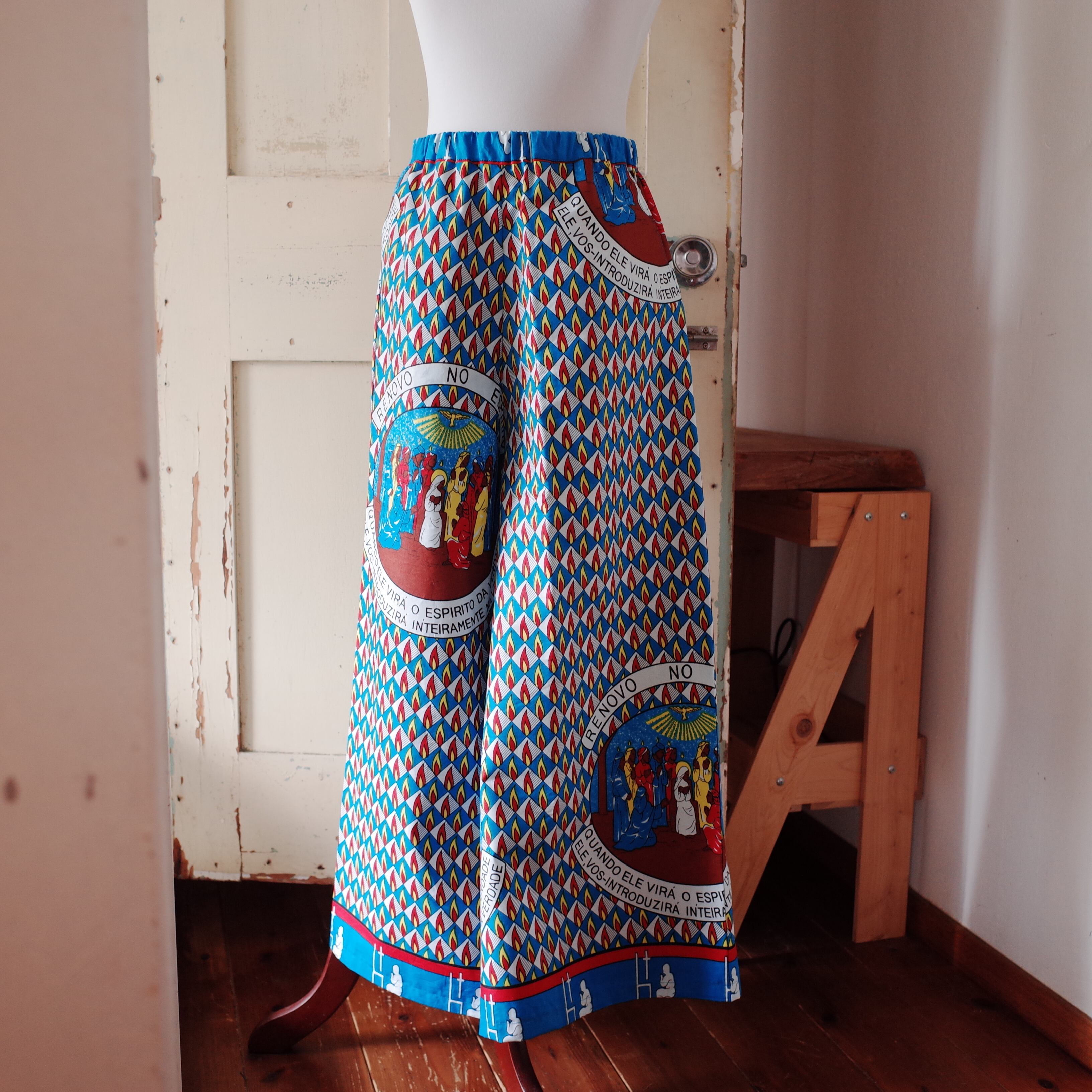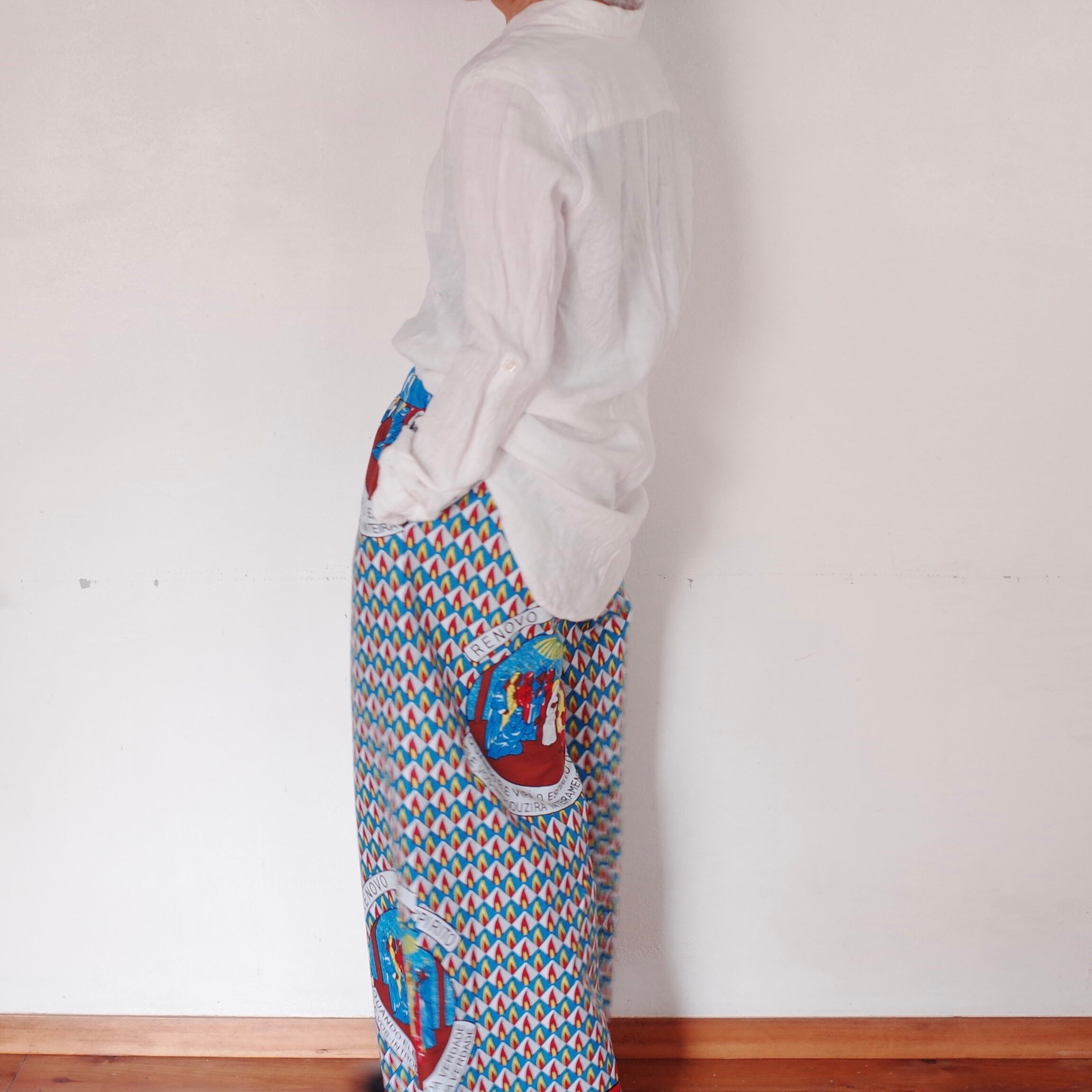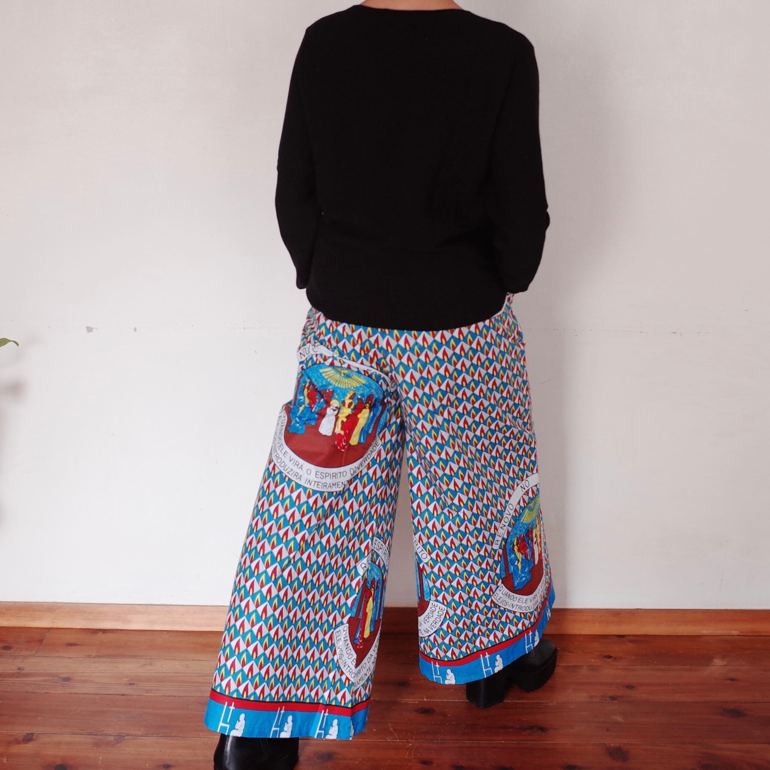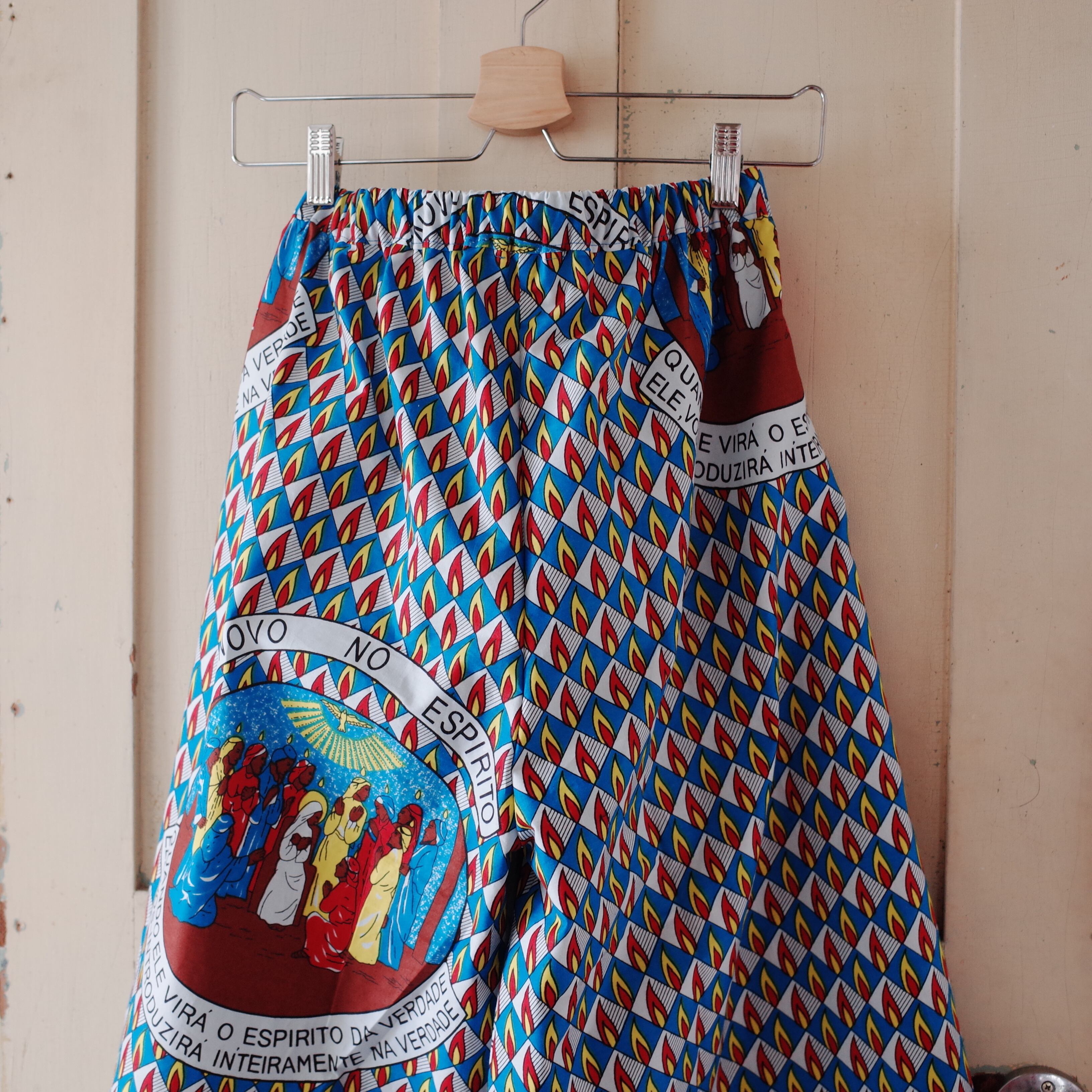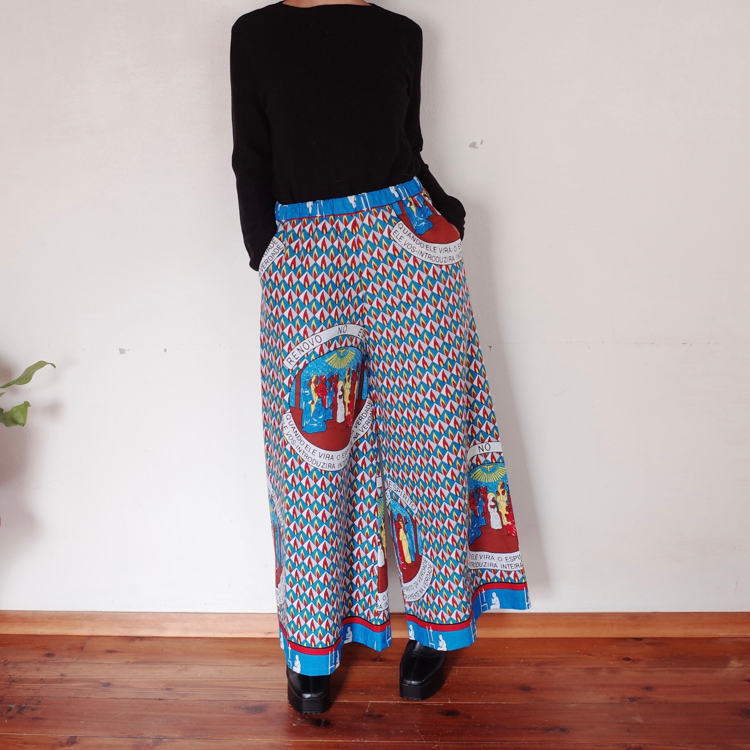 ヨガもできそうなリラックスできる作りですが、合わせるトップスによってカジュアルにもスタイリッシュにも着用できます。こちらの生地は、ザンビアのルサカ現地で仕入れました。キリスト教徒の集まる生地屋さんでした。