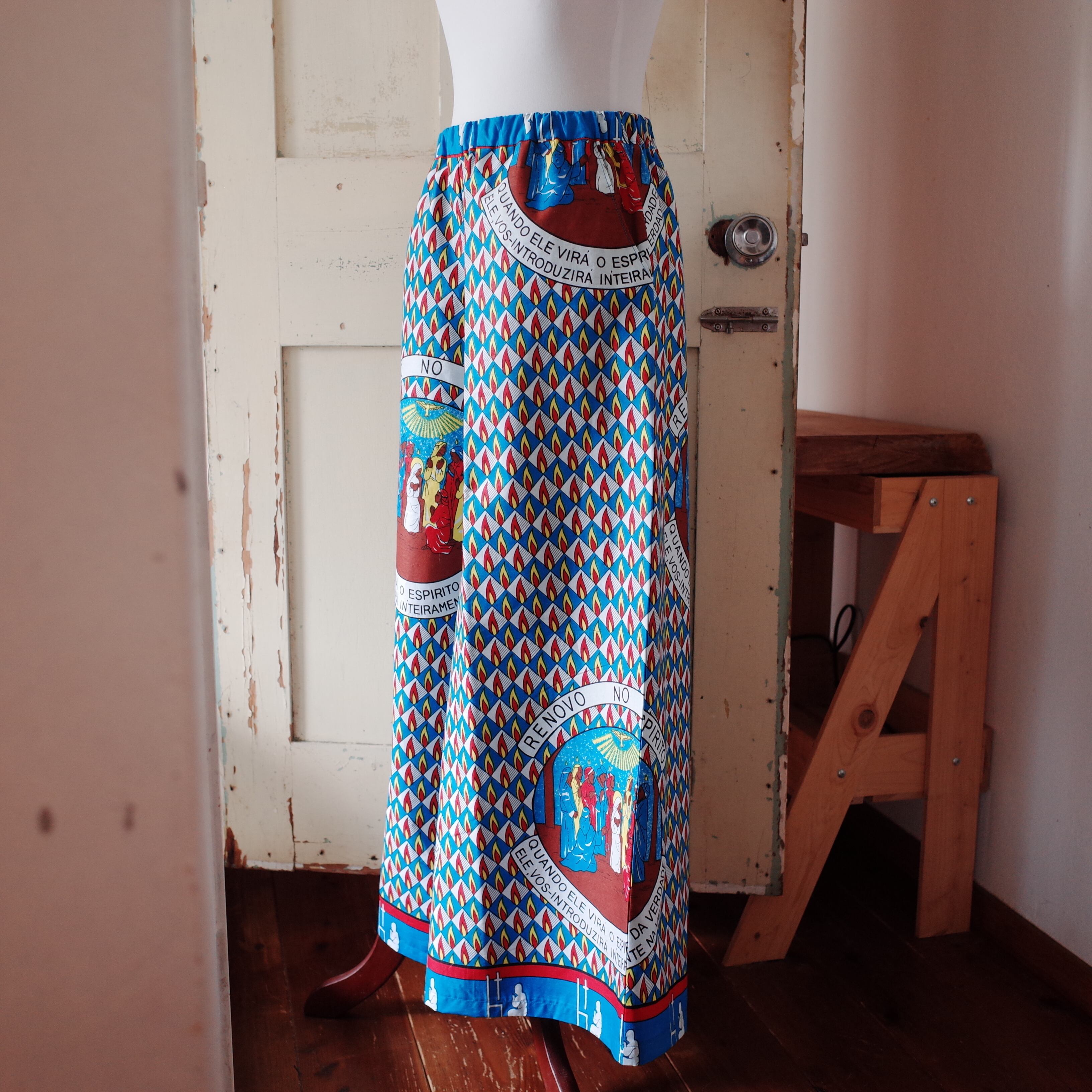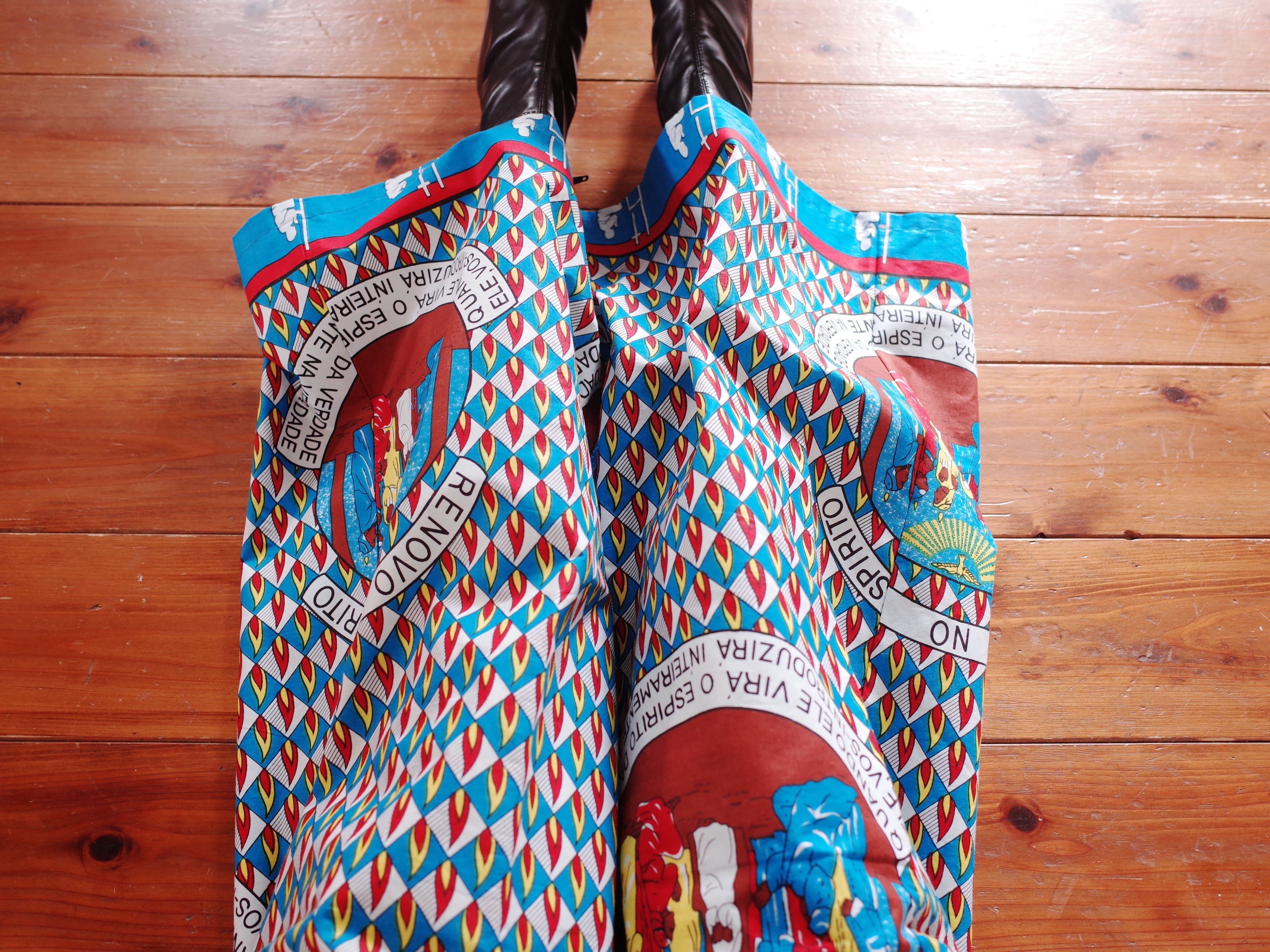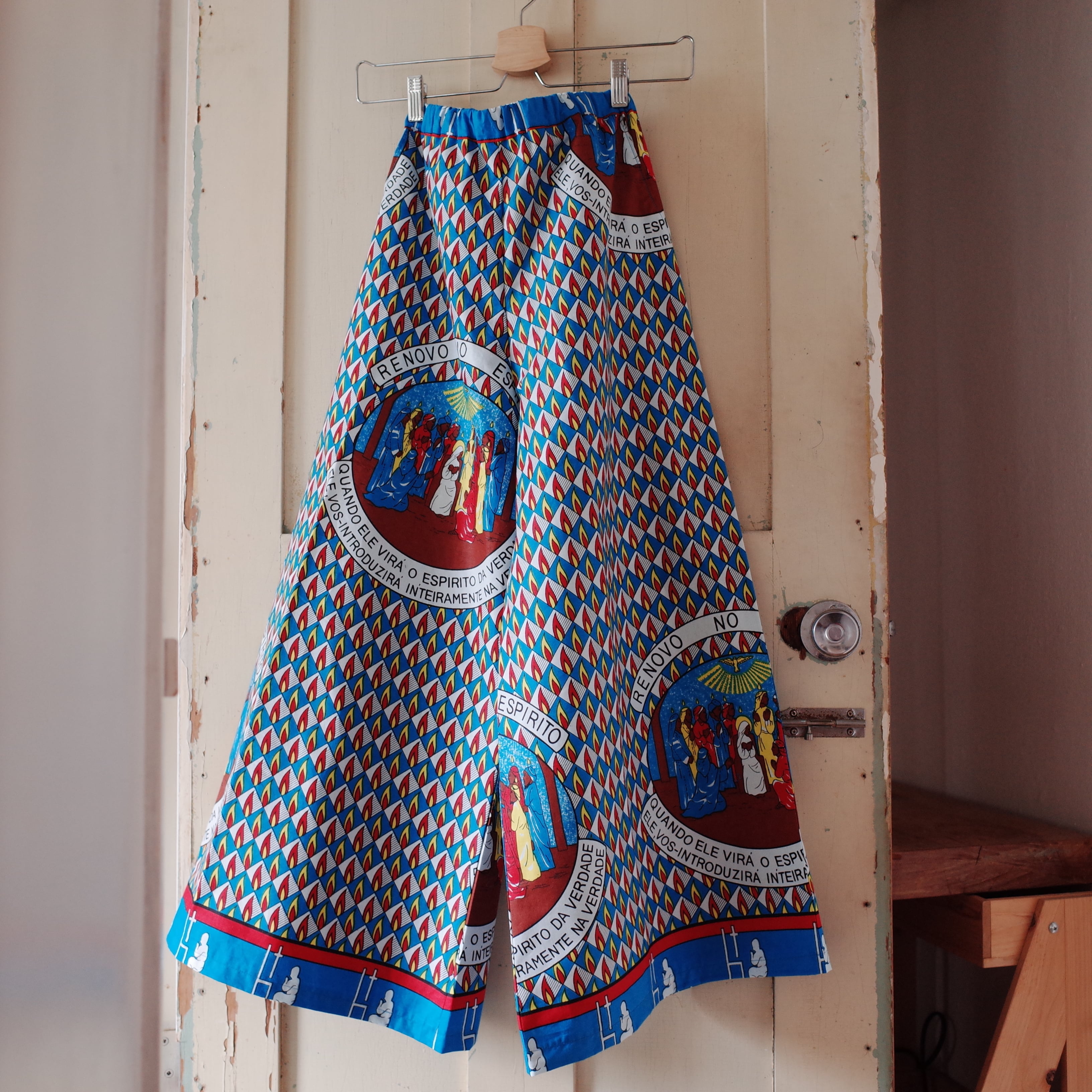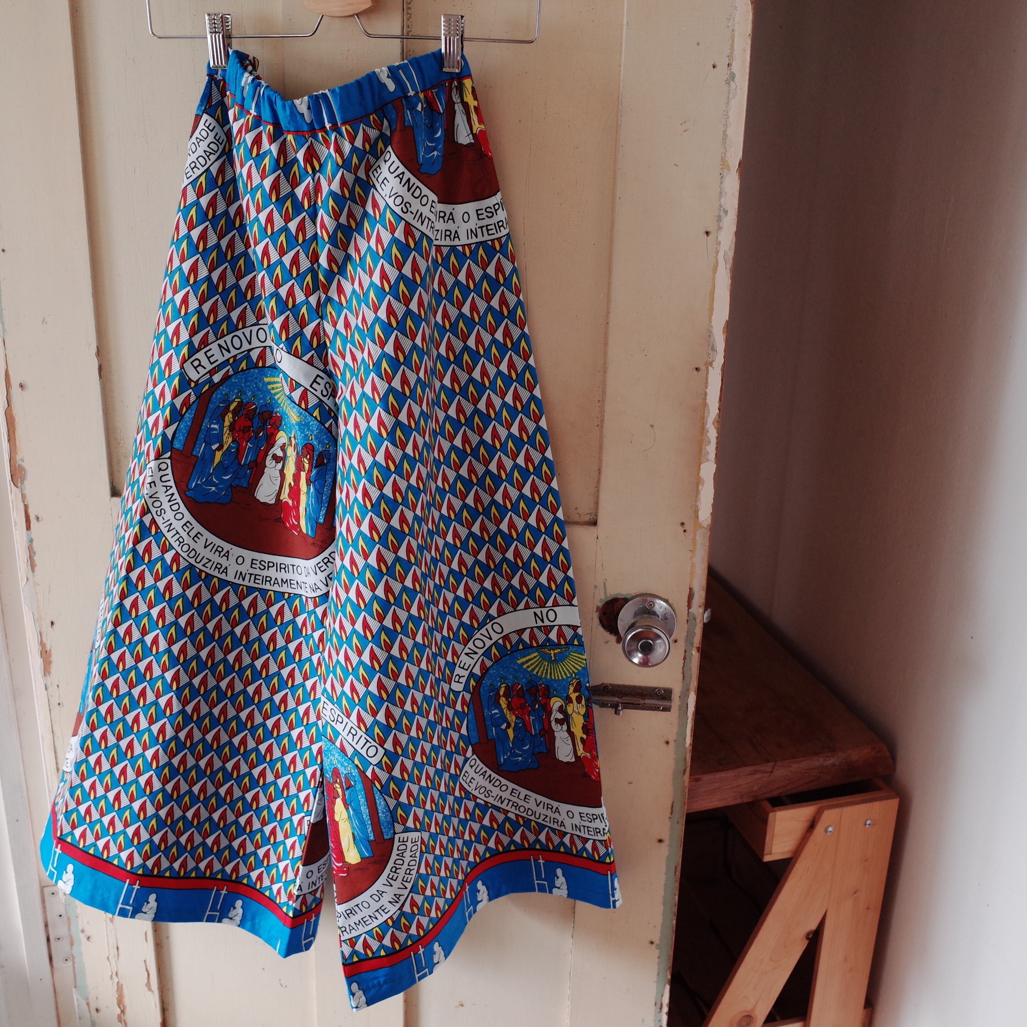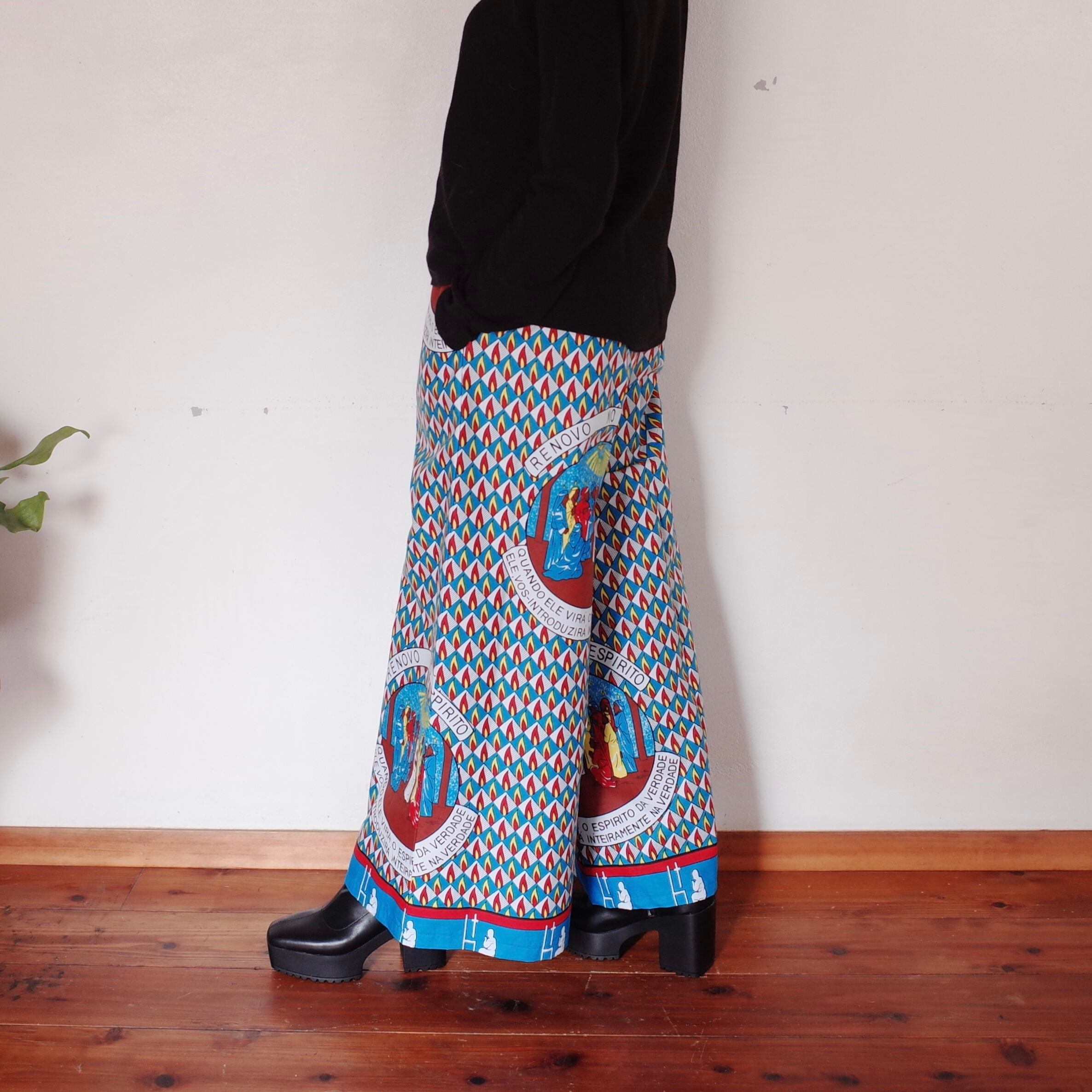 ヨガもできそうなリラックスできる作りですが、合わせるトップスによってカジュアルにもスタイリッシュにも着用できます。こちらの生地は、ザンビアのルサカ現地で仕入れました。キリスト教徒の集まる生地屋さんでした。