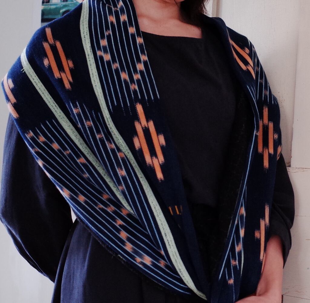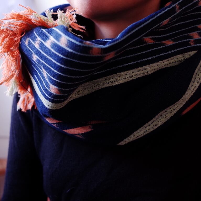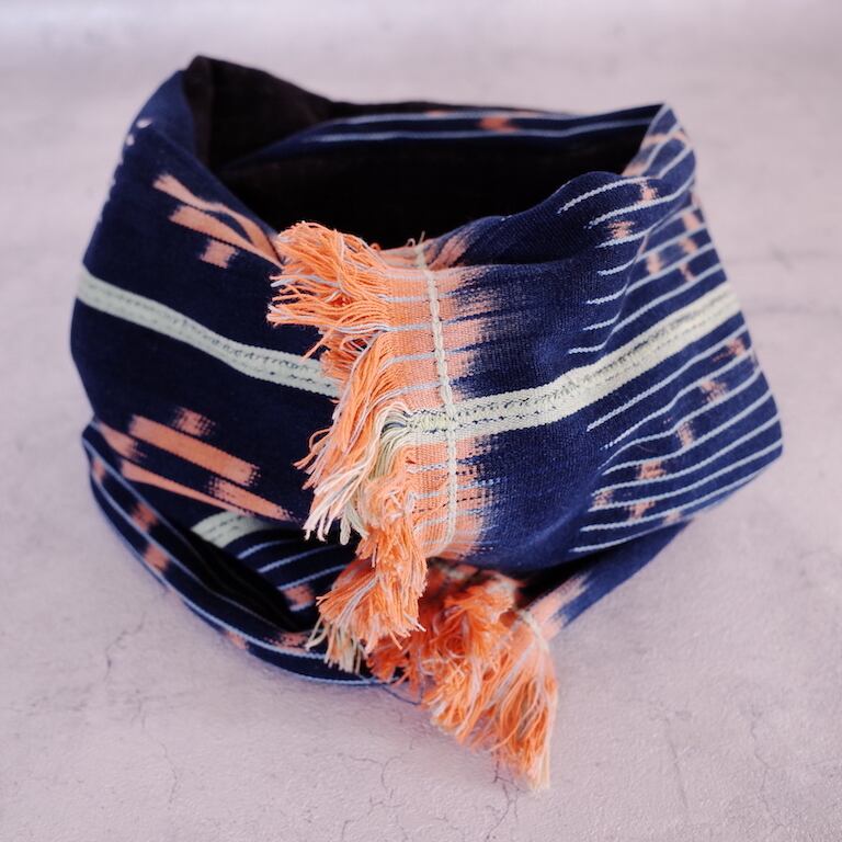 バウレ族藍染め生地の大きめスヌードです。同じような模様の生地はありますが、1枚1枚手作業で制作されていますので、完全に同じ柄の布はなく「1枚1枚が世界で1枚」の生地を使用しています。