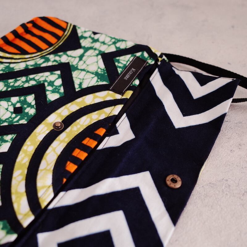 表地はコレリがセレクトしてナイロビから仕入れたアフリカンプリント布(キテンゲ)を使用、裏地は兵庫県西脇市の伝統先染め織り布、播州織を使用しています。