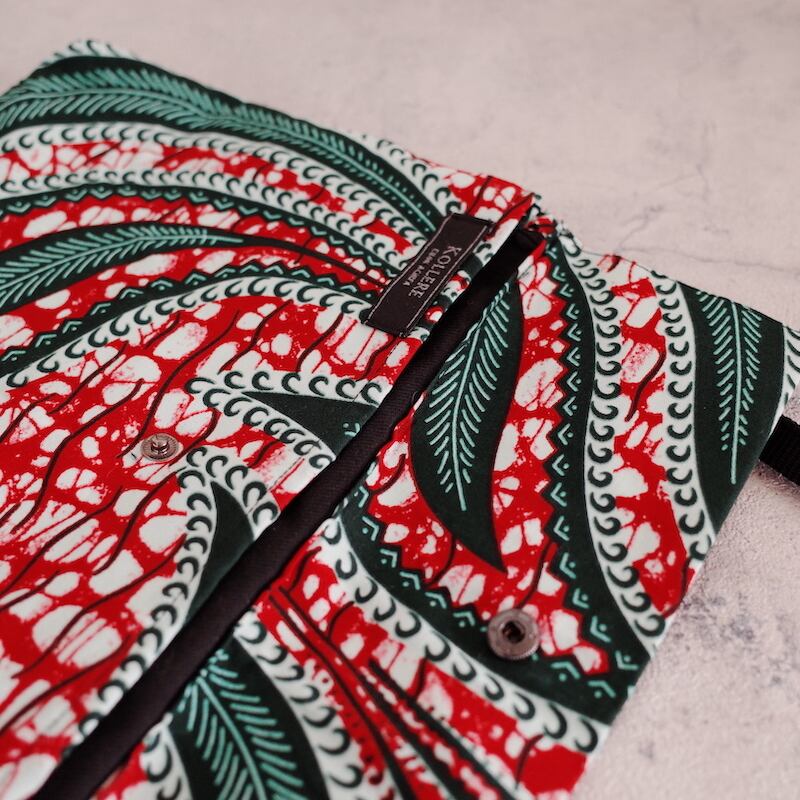 表地はコレリがセレクトしてナイロビから仕入れたアフリカンプリント布(キテンゲ)を使用、裏地は兵庫県西脇市の伝統先染め織り布、播州織を使用しています。