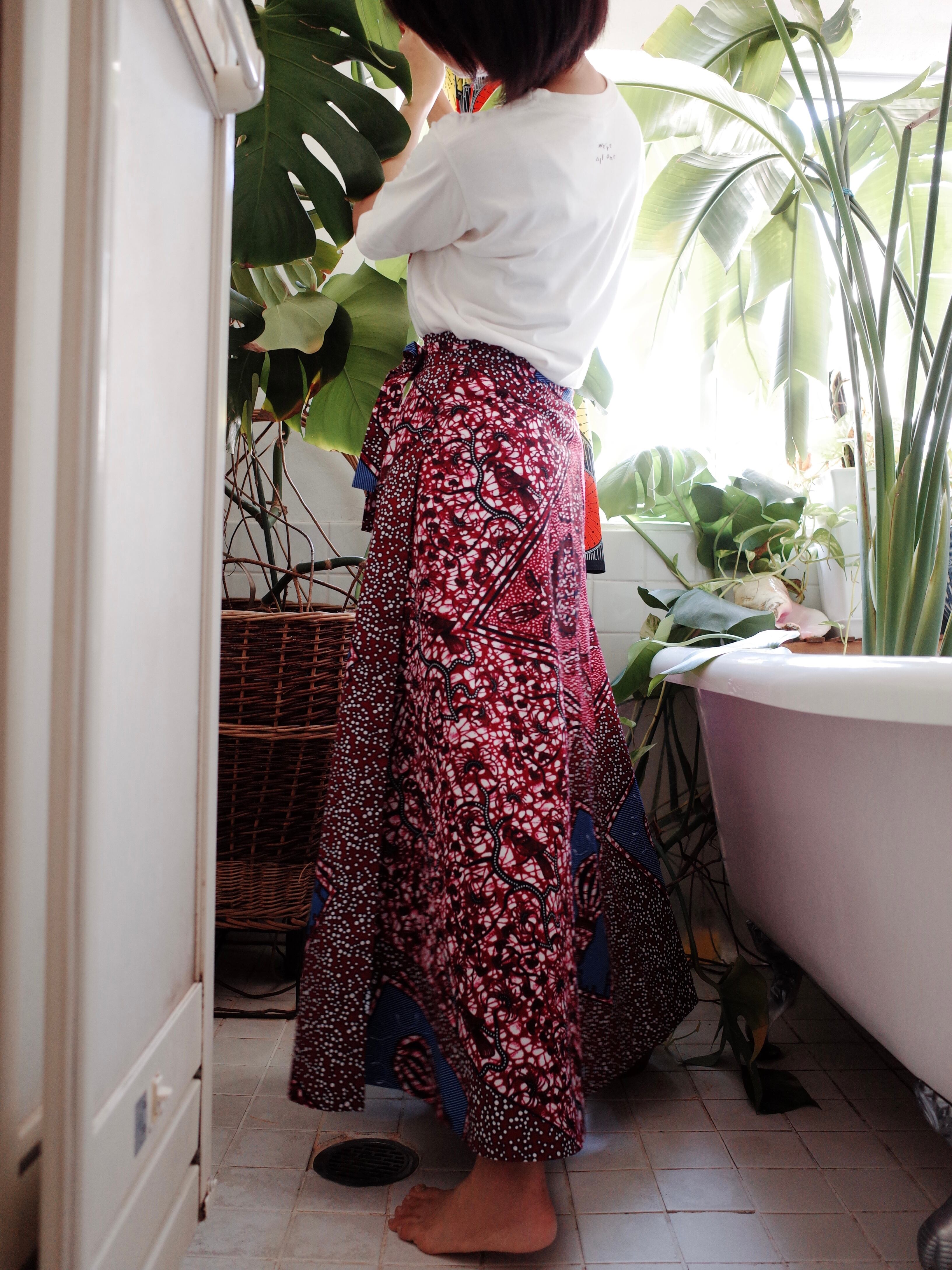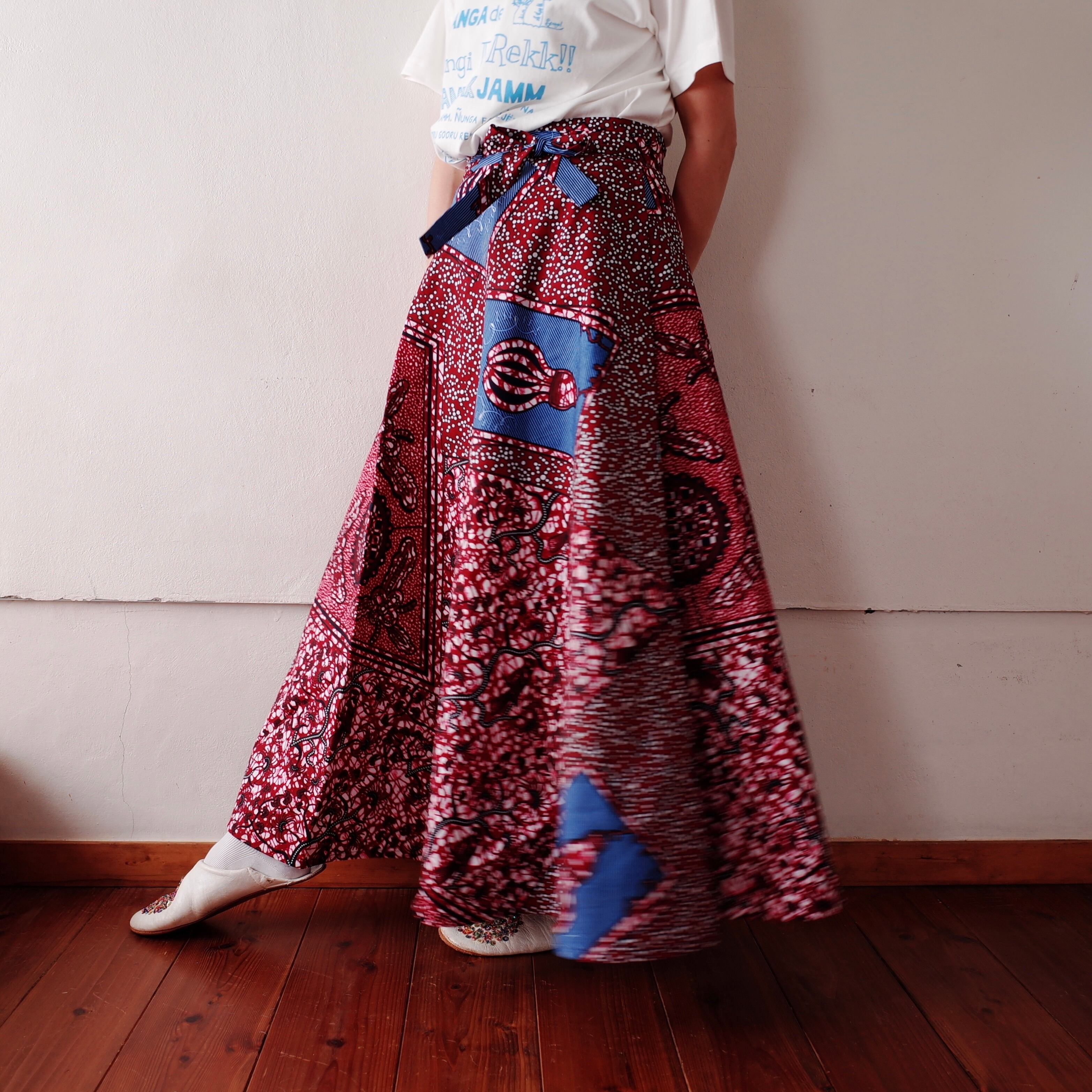 ケニアから仕入れたアフリカンプリント布(キテンゲ布)の巻きスカートです。仕入れる生地はお店でセレクトしています。布を3m弱使った半円形の巻きスカートは、裾に余裕があり歩きやすくフレアがとても美しいです。分厚めの布を使用していますので、インナーなしで1枚で着られます。寒い時期はタイツやブーツと合わせてもかわいいです。紐通しの裏側に紐を通すホールがあり、しっかりと着用いただけますので、紐がほどけた場合も安心です。