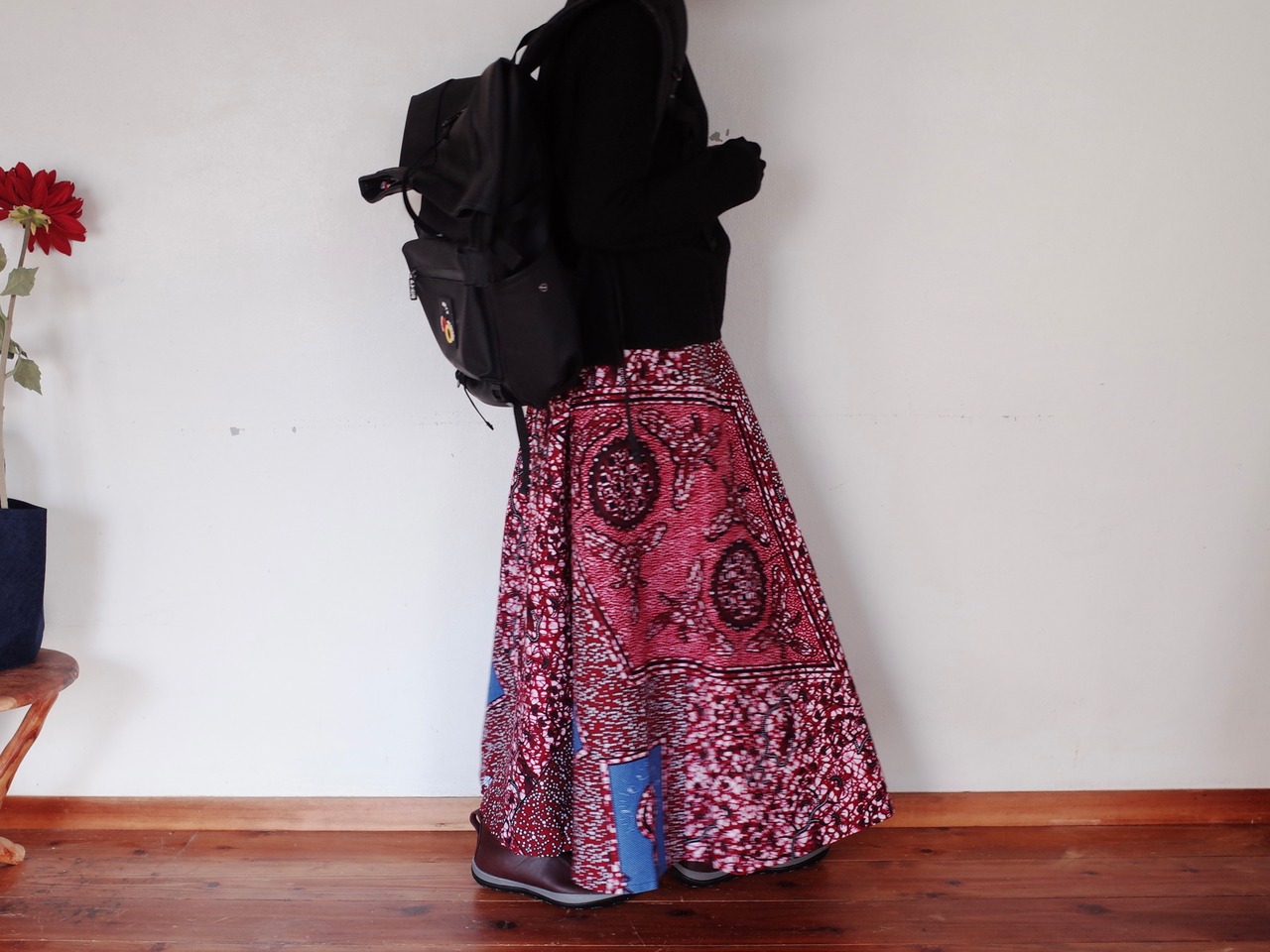 特長: ケニアから仕入れた発色が良く、分厚めのキテンゲ布を使っていますので、洗っても型崩れがしにくいしっかりした布です。合わせるトップスや靴で、カジュアルにもフォーマルにも着られます。