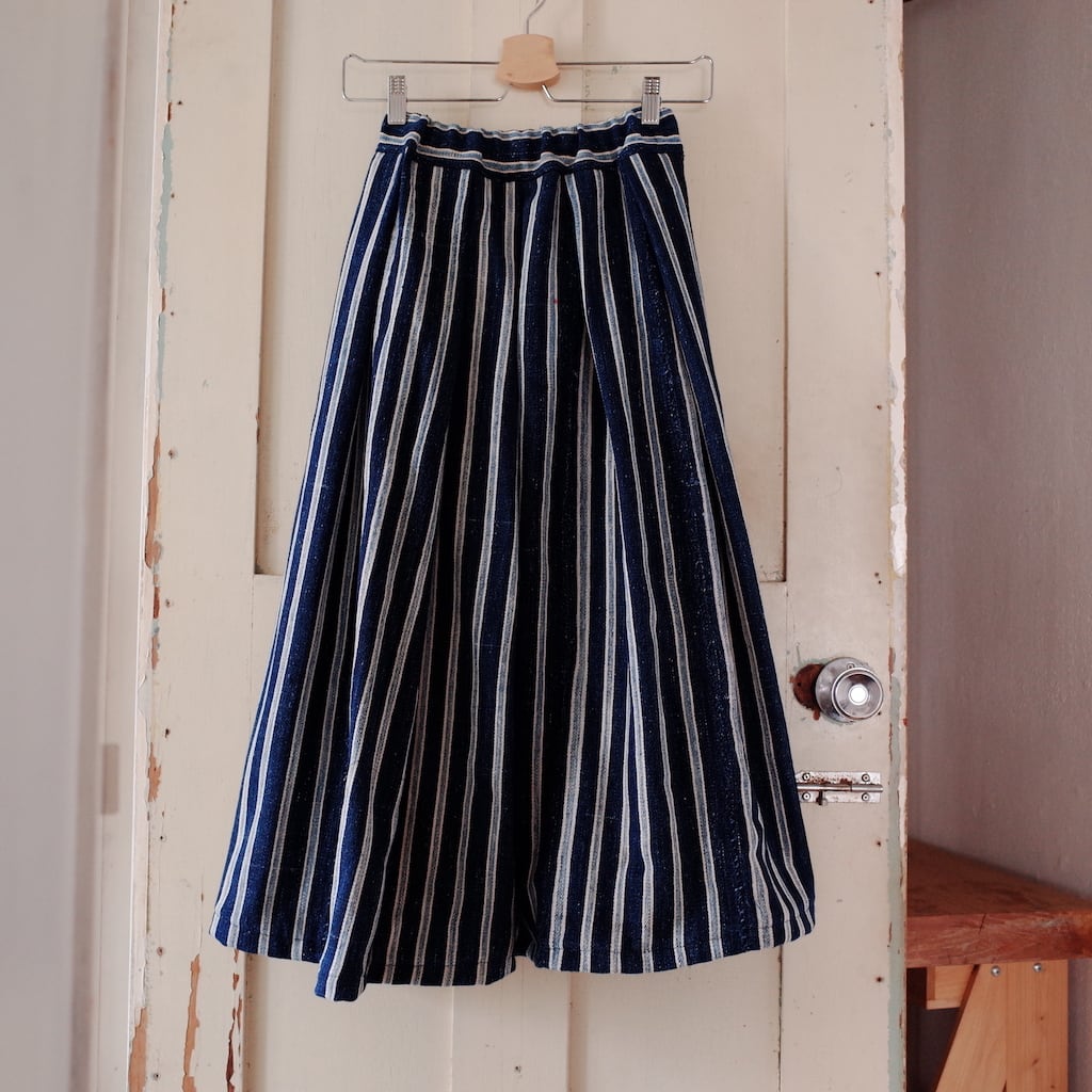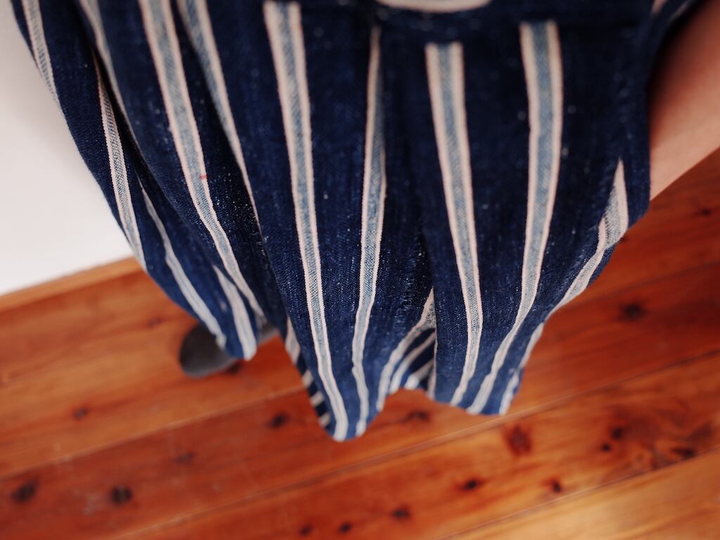 ブルキナファソのダフィン族の伝統藍染生地のスカートです。藍染した糸を縞模様に手織りした帯状の生地を繋ぎ合わせて1枚の大きな生地にしています。ずっしりと厚みのある貴重な生地を余すことなく1枚すべて使いました。こちらは、縞模様の幅をランダムに変化をつけていて、アフリカンデザインのセンスが光ります。1枚1枚手織りですので、全く同じデザインの生地はほとんど見つけることができません。こちらの生地は写真の8-9枚目にあるように前スカートのウエスト下に小さな赤いシミがございます。生地自体にあったシミでほとんど目立ちません。古布のためご了承ください。