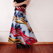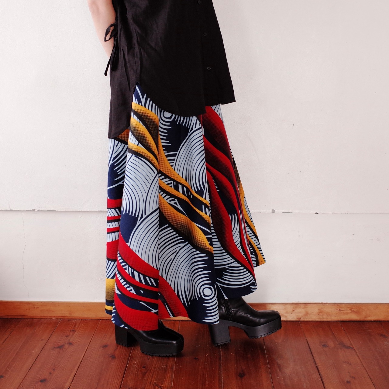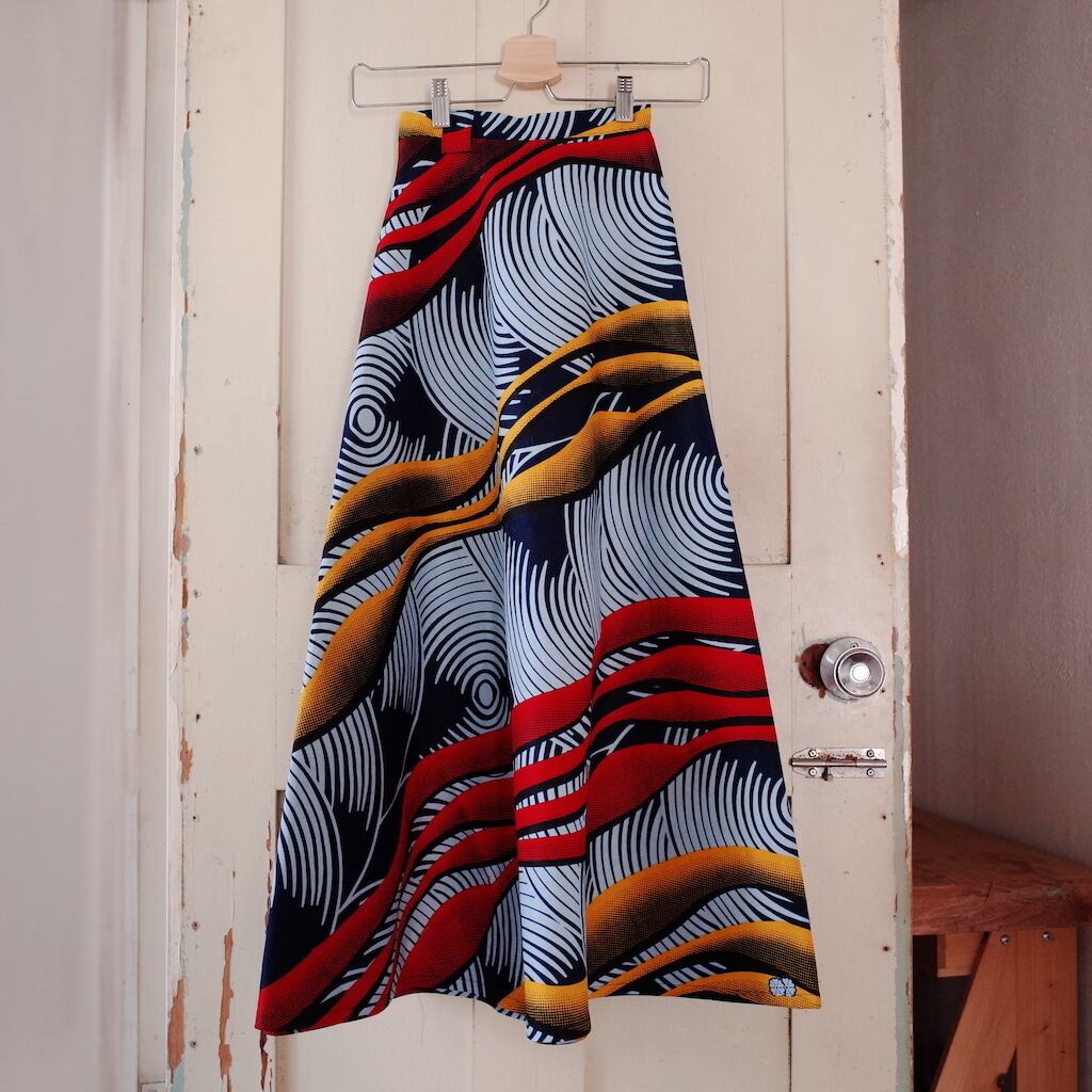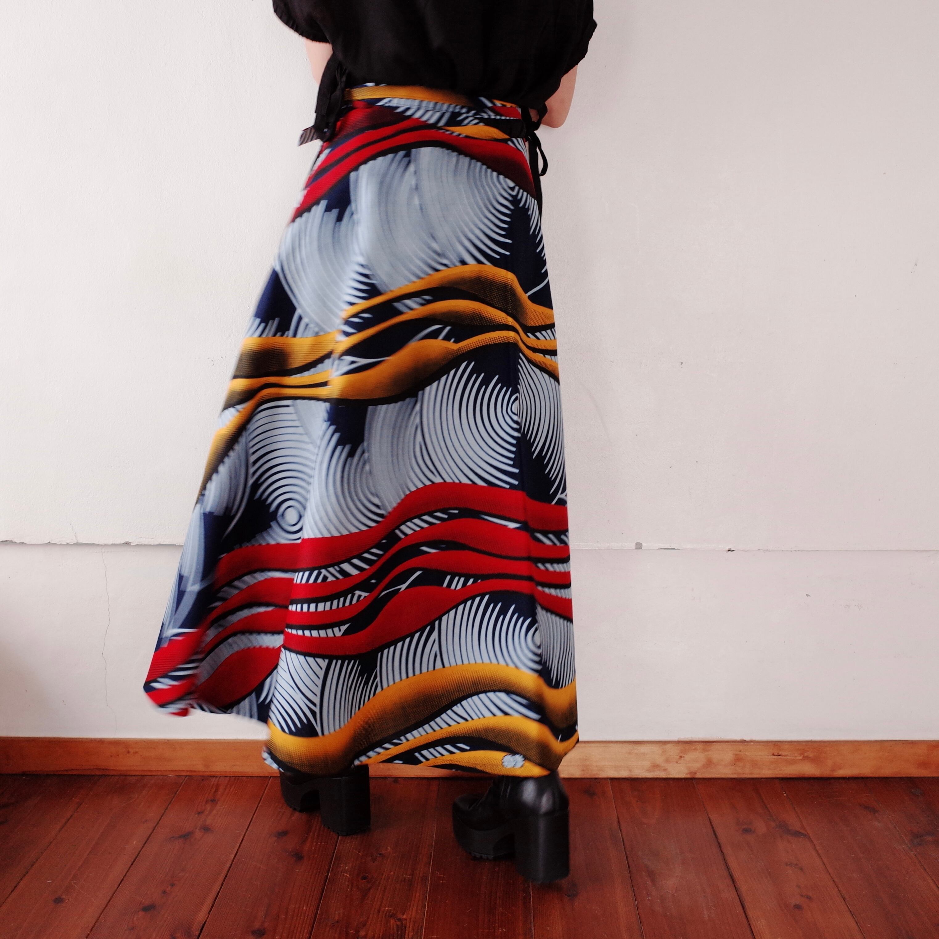 ケニアから仕入れたアフリカンプリント布(キテンゲ布)の半円形の巻きスカートです。仕入れる生地は1枚1枚お店でセレクトしています。布を3m弱使った半円形の巻きスカートは、裾に余裕があり歩きやすくフレアがとても美しいです。分厚めの布を使用していますので、インナーなしで1枚で着られます。寒い時期はタイツやブーツと合わせてもかわいいです。紐通しの裏側に紐を通すホールがあり、しっかりと着用いただけますので、紐がほどけた場合も安心です。