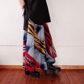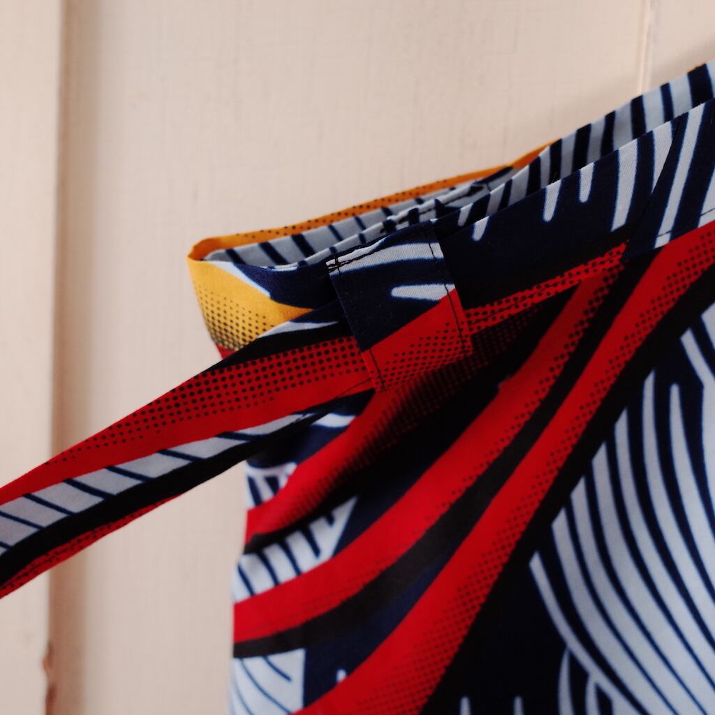 特長: ケニアから仕入れた発色が良く、分厚めのキテンゲ布を使っていますので、洗っても型崩れがしにくいしっかりした布です。合わせるトップスや靴で、カジュアルにもフォーマルにも着られます。