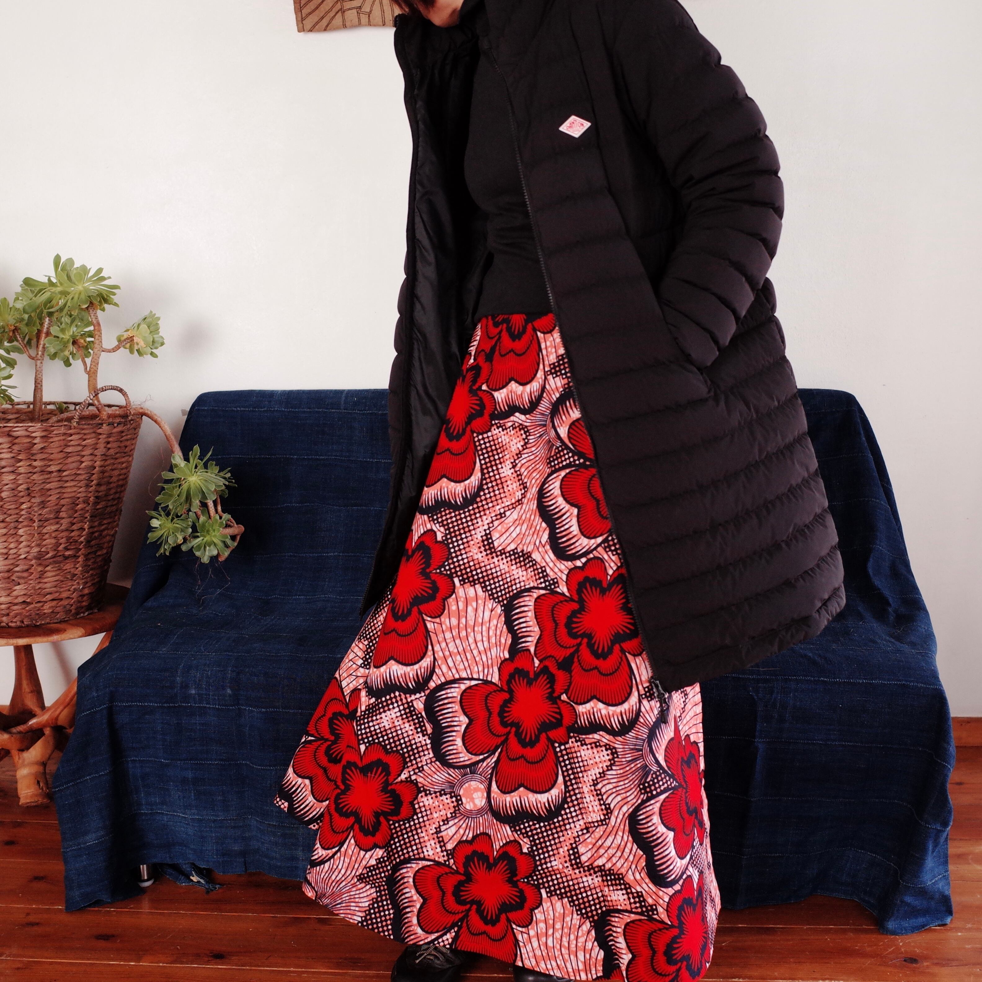 ケニアから仕入れたアフリカンプリント布(キテンゲ布)の半円形の巻きスカートです。仕入れる生地は1枚1枚お店でセレクトしています。布を3m弱使った半円形の巻きスカートは、裾に余裕があり歩きやすくフレアがとても美しいです。分厚めの布を使用していますので、インナーなしで1枚で着られます。寒い時期はタイツやブーツと合わせてもかわいいです。紐通しの裏側に紐を通すホールがあり、しっかりと着用いただけますので、紐がほどけた場合も安心です。