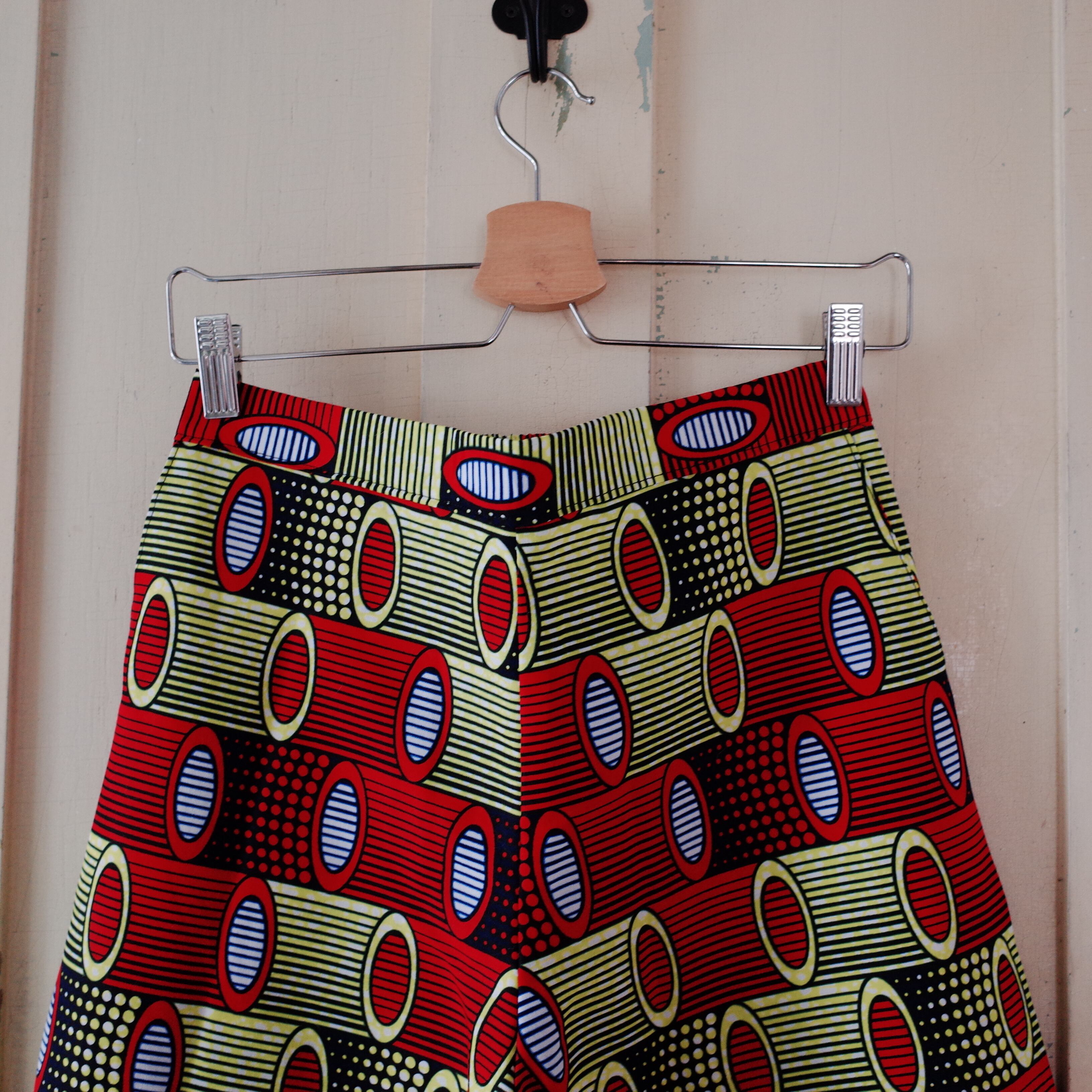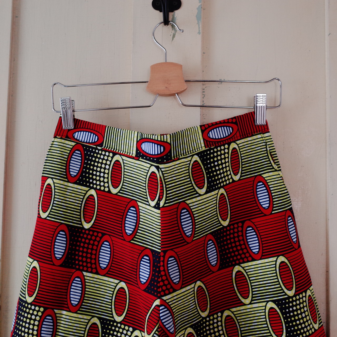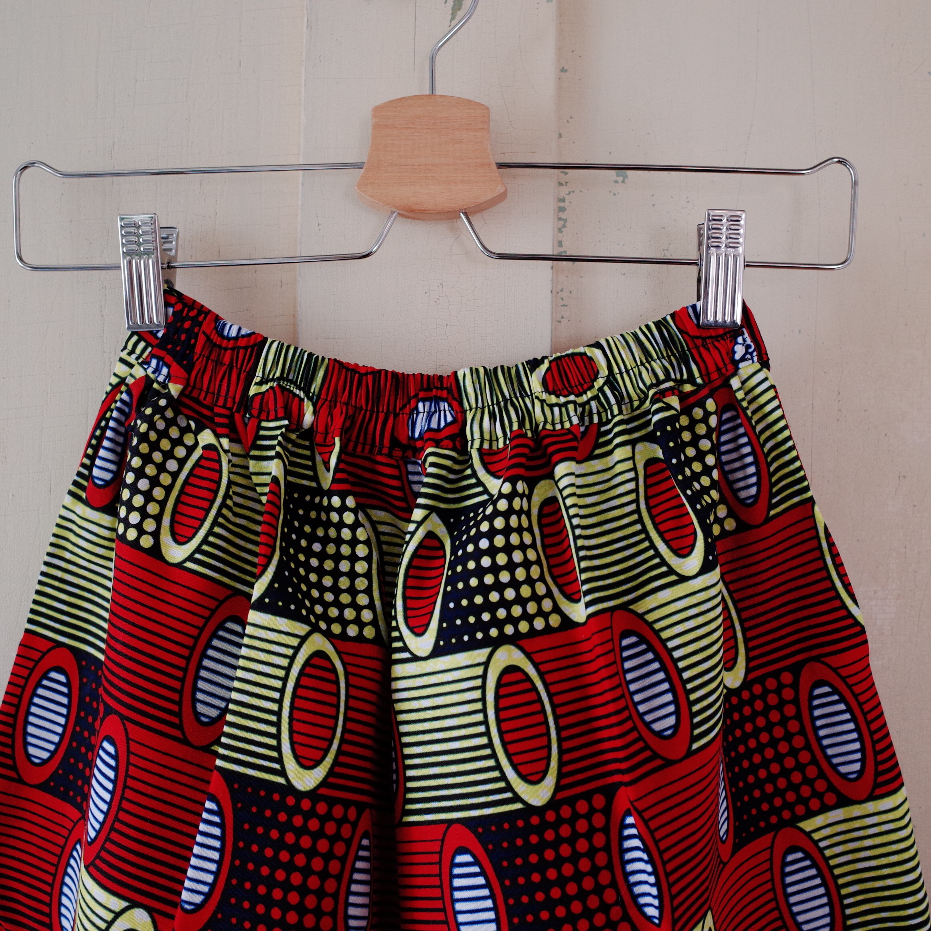 着心地の良さとシルエットにこだわって改良を重ねたワイドパンツです。ウエストゴムはヒップ側のみ、前側はゴムなしで芯地を入れています。前側はすっきりストレート、ヒップ側は立体感があります。ポケットは大きめに作っています。ヨガもできそうなリラックスできる作りですが、スタイリッシュにも着用できるデザインです。ナイロビから仕入れたアフリカンプリント布(キテンゲ)はコレリが柄を1枚1枚セレクトして仕入れています。柄が活きるようにできる限り柄合わせをしています。