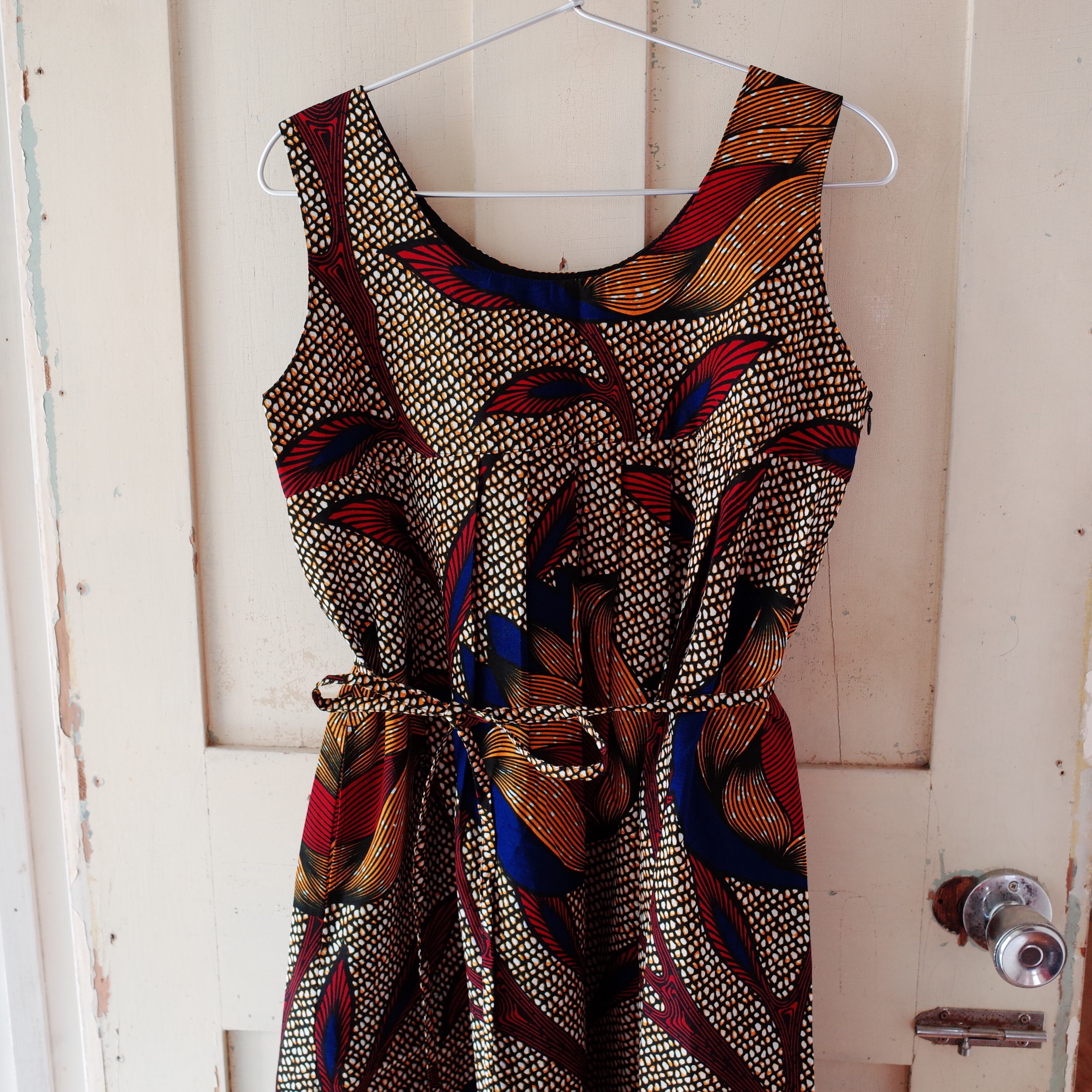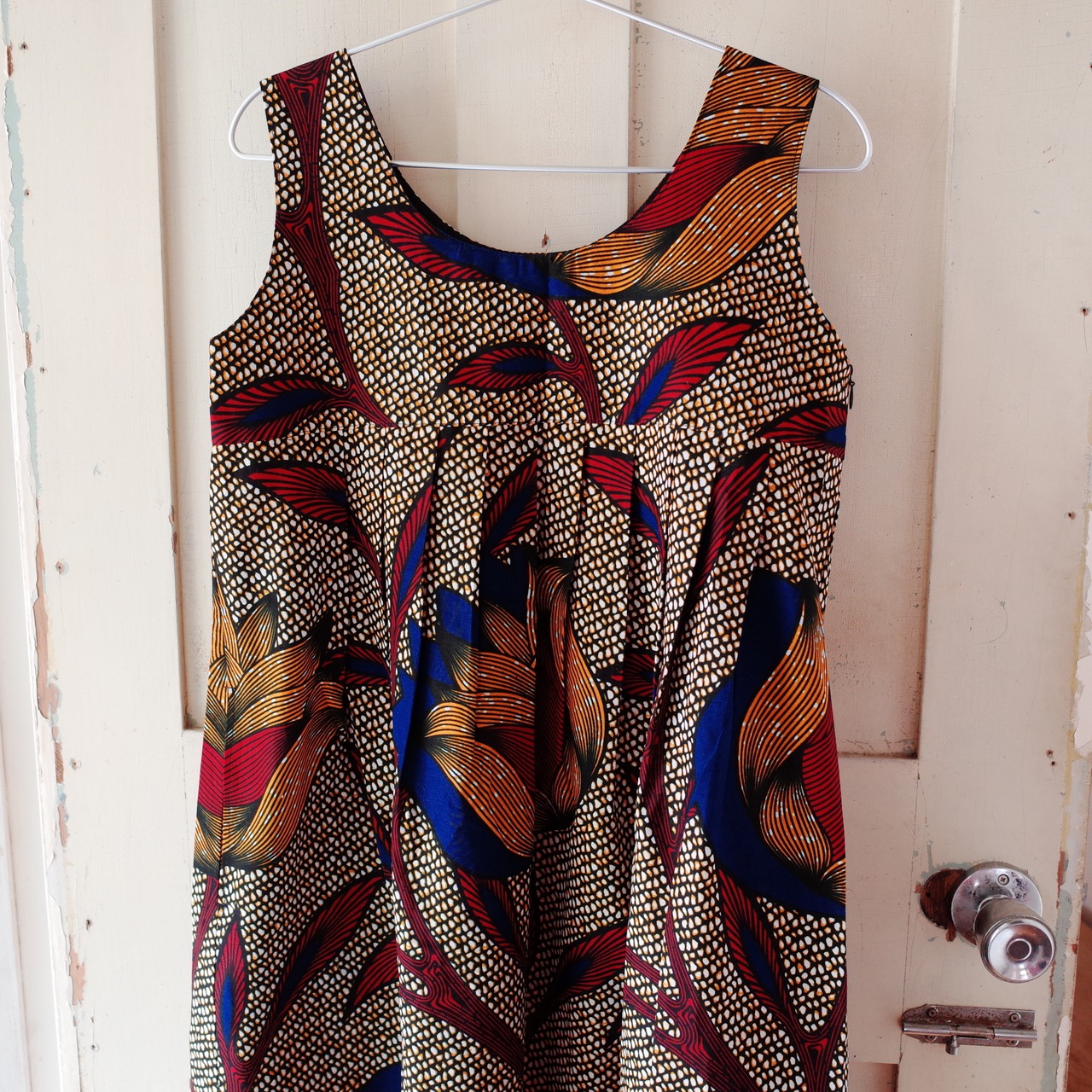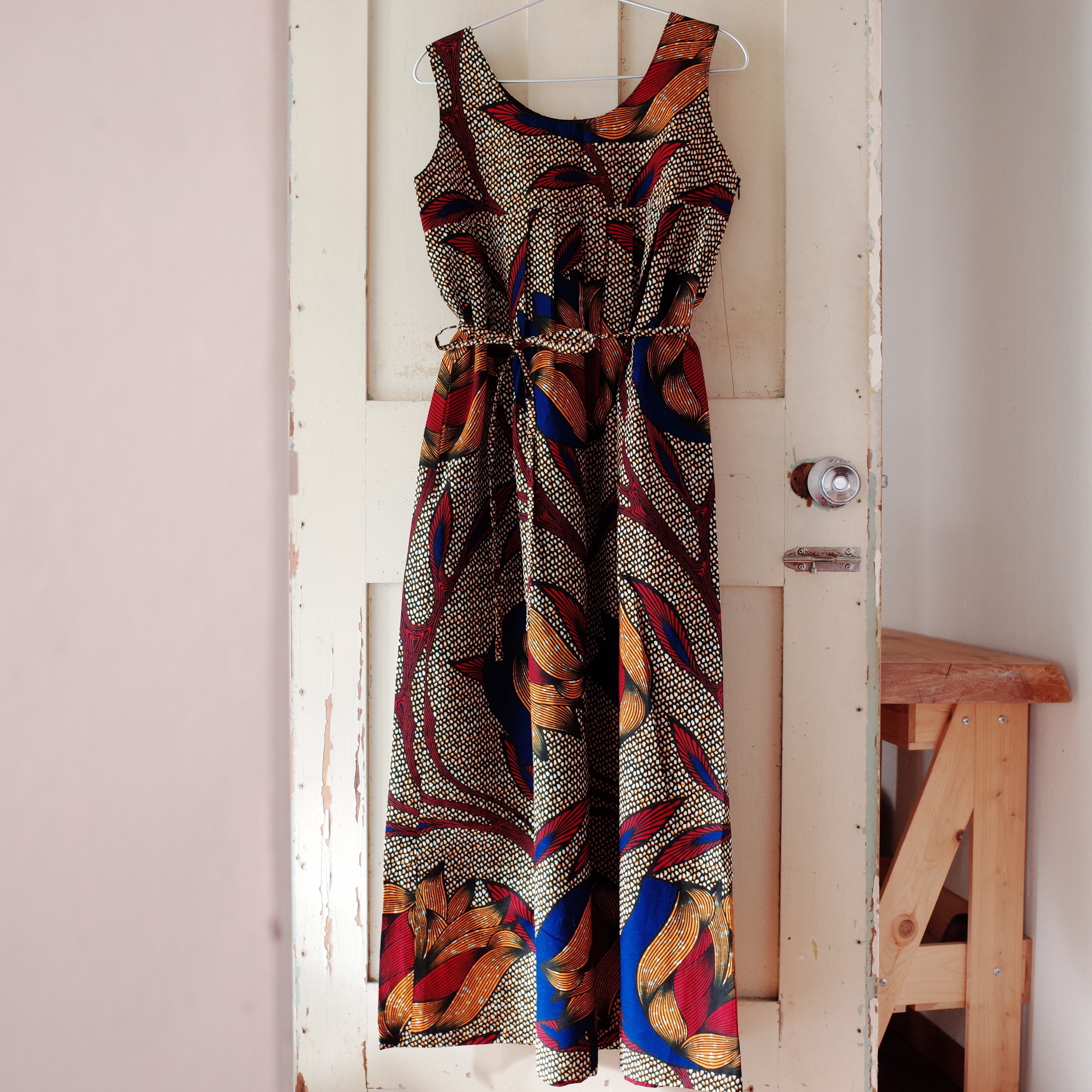 ケニアから仕入れたアフリカンプリント布(キテンゲ布)のノースリーブワンピースです。