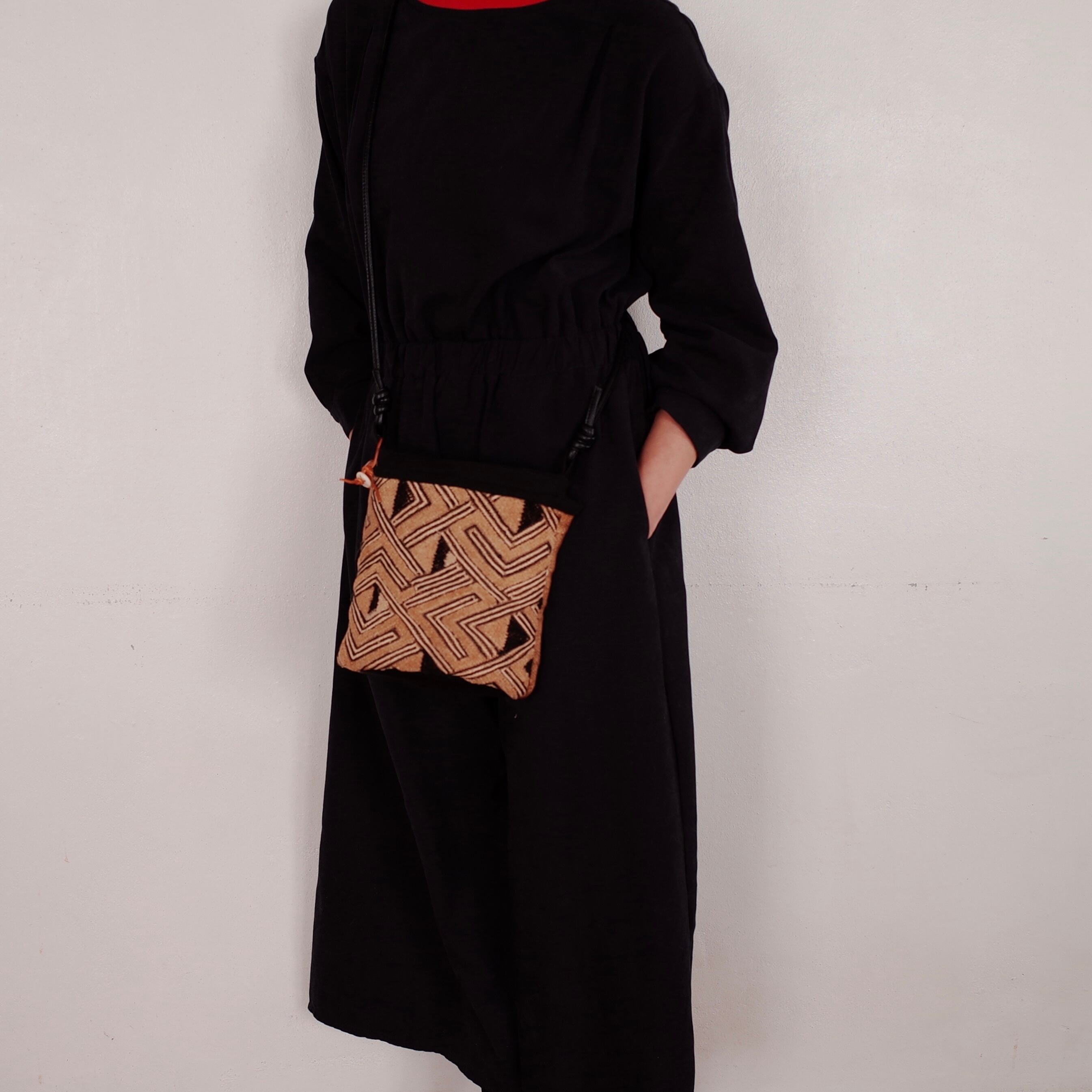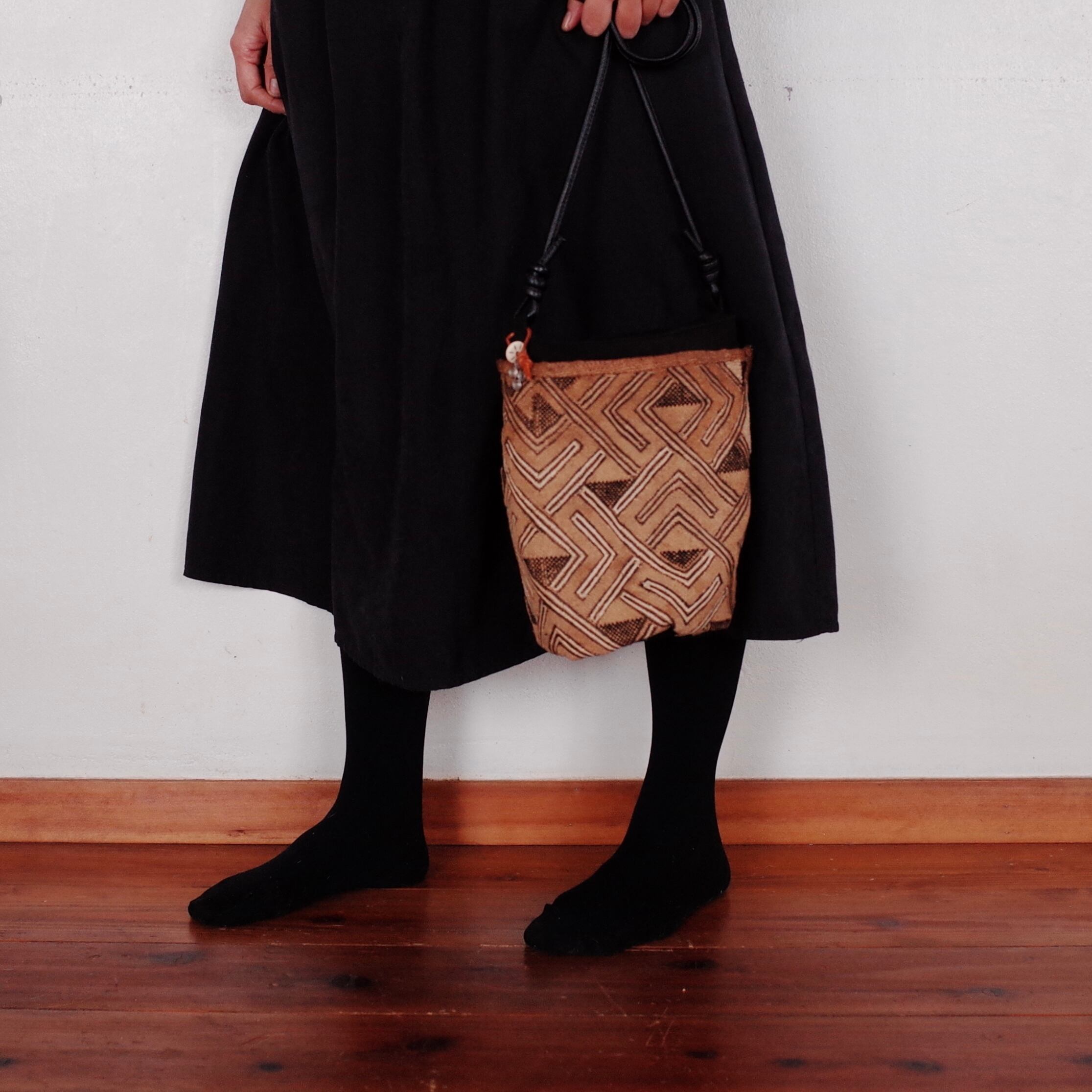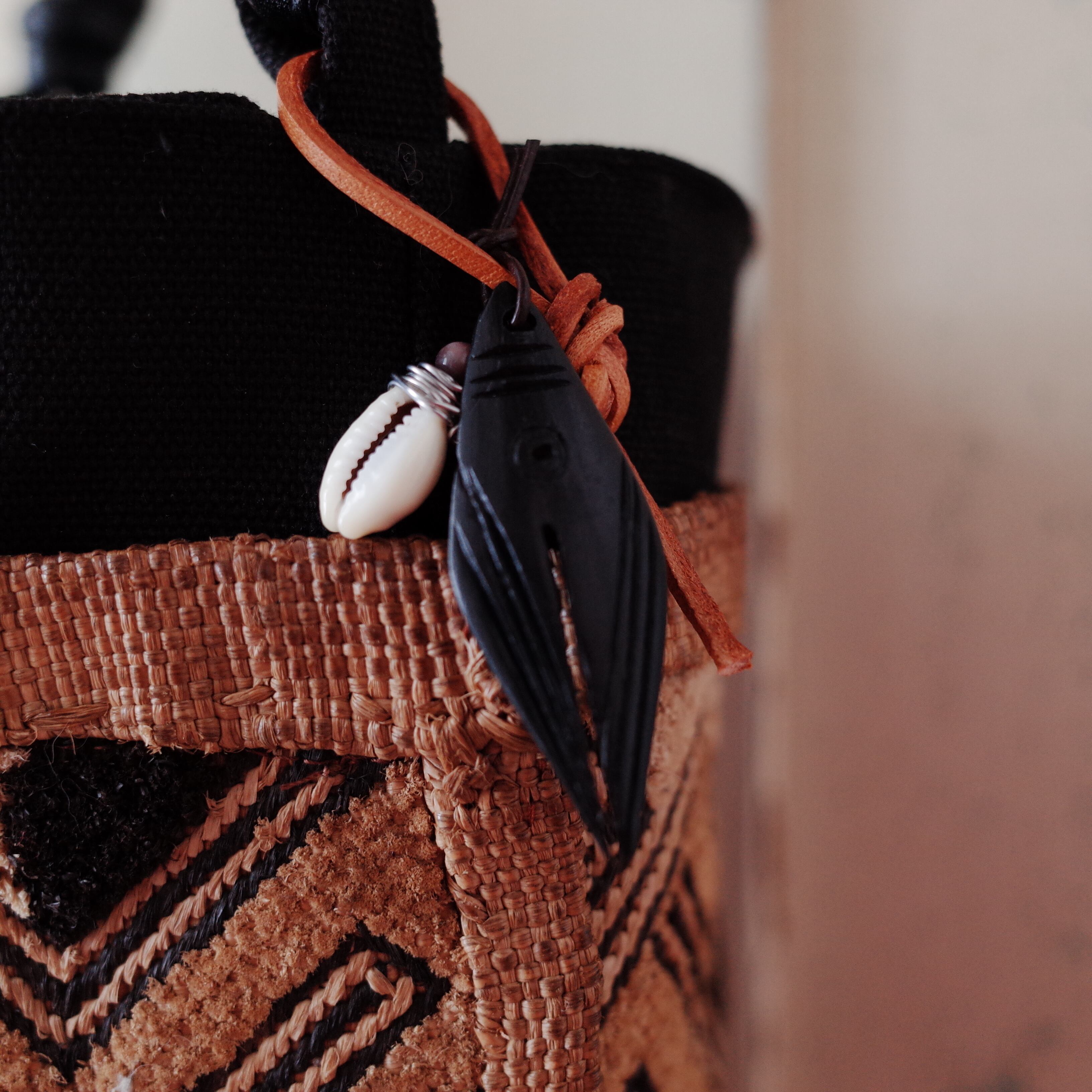 底部分は柔らいですがしっかり厚めのブラックの本革、ショルダーの革紐は作家さんが手作りしたものになります。チャームは気まぐれにアフリカ各地のビーズやクロスチャームなどから選んでつけています。